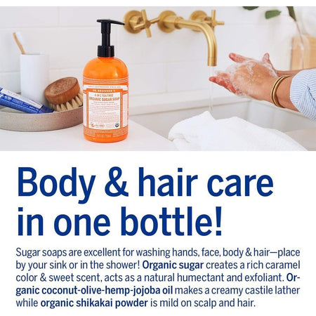 4-in-1 Organic Pump Soaps are good for washing hands, face, body & hair – place by your sink or in the shower! To wash hair work one pump of Organic Pump Soap into wet hair until it lathers, then rub and rinse. Repeat for thicker or longer hair. After washing, follow up with a lightly acidic conditioning rinse, like Dr. Bronner’s Citrus Organic Hair Rinse to leave hair silky smooth! Don’t have the Organic Hair Rinse? Use diluted apple cider vinegar or lemon juice!