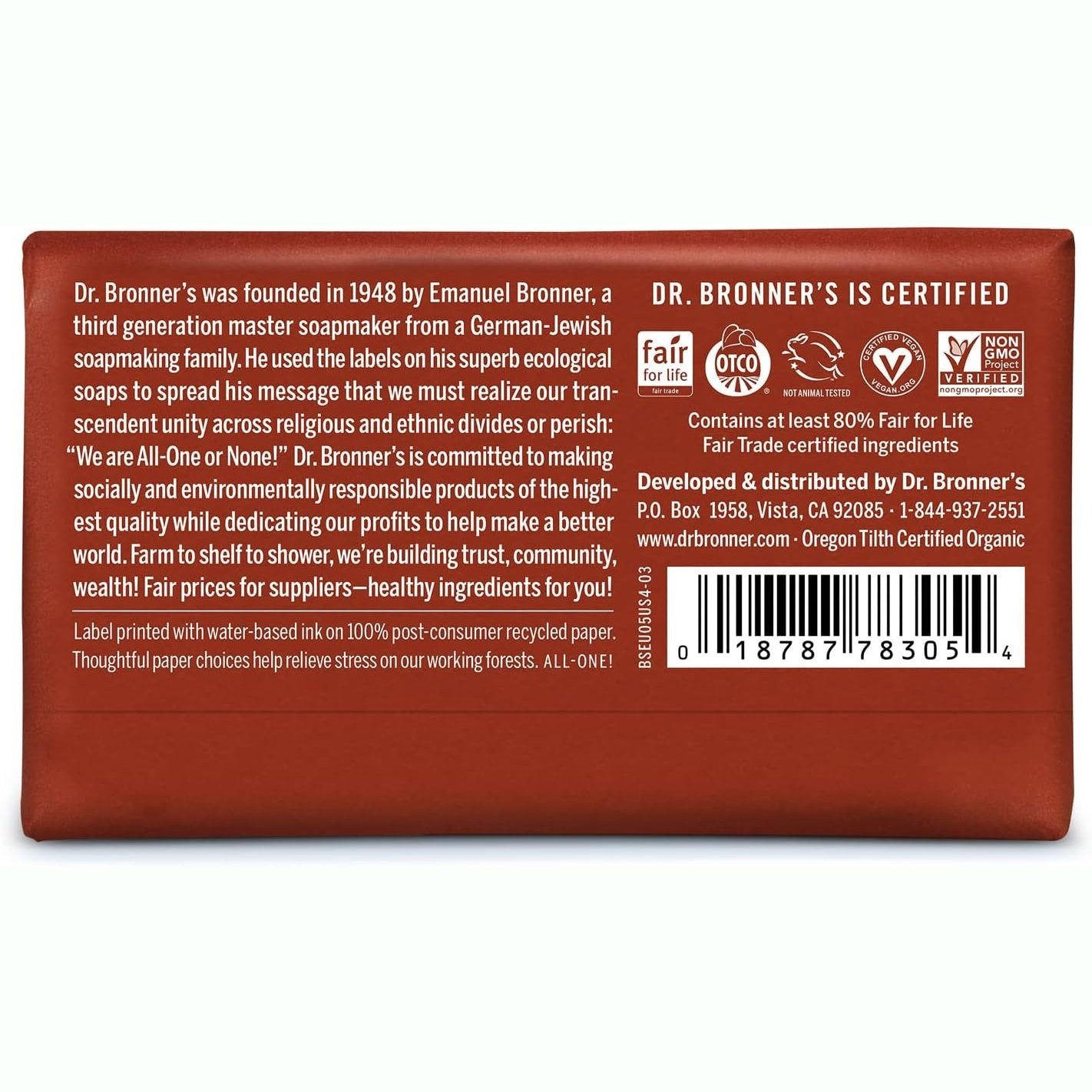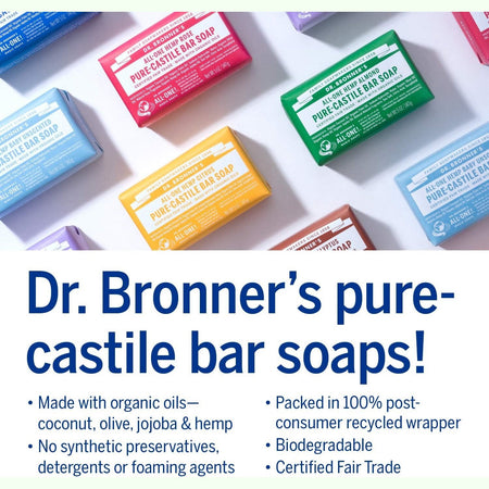Dr. Bronner’s Pure-Castile Bar Soaps are biodegradable-vegan, gentle and versatile, good for washing body, face or hair! Enjoy only 2 cosmetics, enough sleep & Dr. Bronner’s Magic Soaps to clean-body-mind-soul-spirit instantly uniting One! All-One!!
