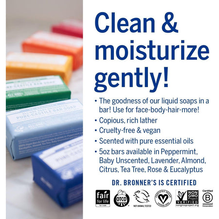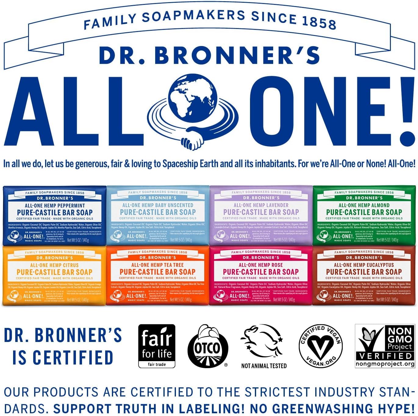 Dr. Bronner’s Pure-Castile Bar Soaps are biodegradable-vegan, gentle and versatile, good for washing body, face or hair! Enjoy only 2 cosmetics, enough sleep & Dr. Bronner’s Magic Soaps to clean-body-mind-soul-spirit instantly uniting One! All-One!!