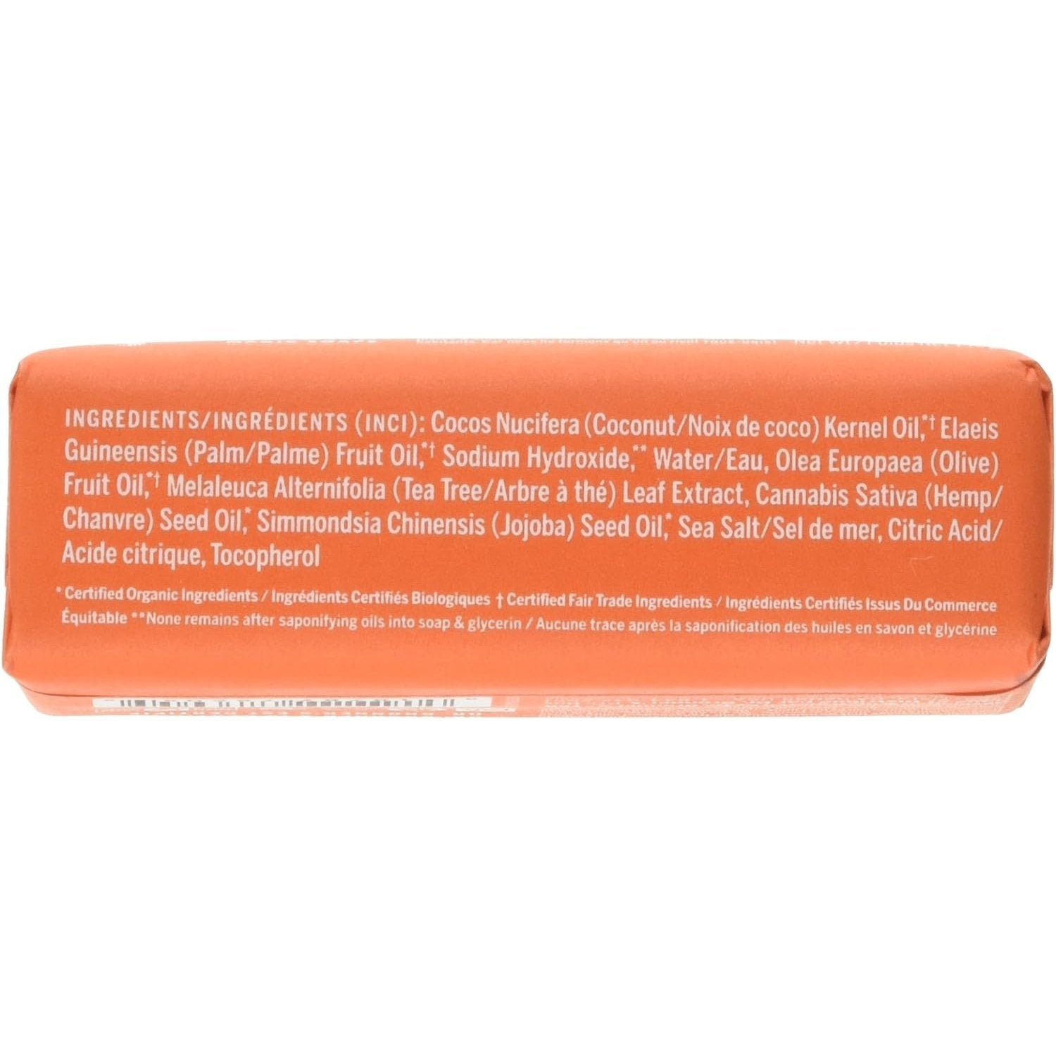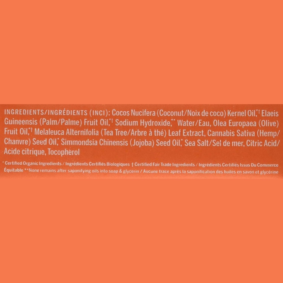 Organic Coconut Oil*, Organic Palm Oil*, Sodium Hydroxide**, Water, Organic Olive Oil*, Tea Tree Extract, Organic Hemp Oil, Organic Jojoba Oil, Sea Salt, Citric Acid, Tocopherol