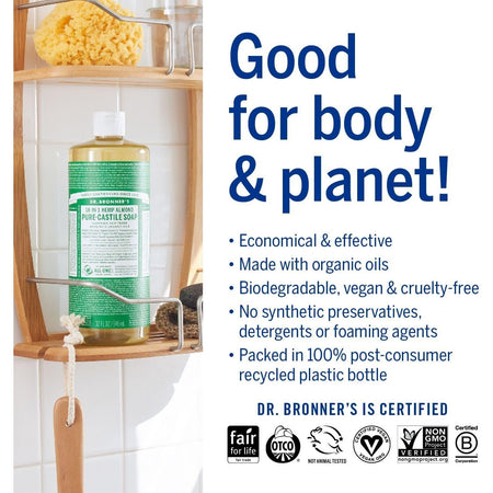 Dr. Bronner's 18-in-1 Pure-Castile Soaps are good for just about any cleaning task. Face, body, hair and food, dishes, laundry, mopping, pets! Clean your house and body with no synthetic preservatives, detergents or foaming agents! None!