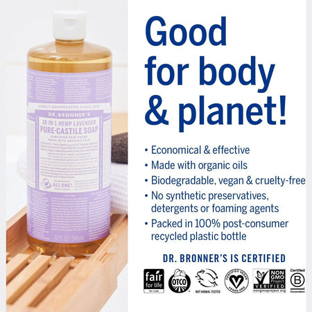 Dr. Bronner’s 18-in-1 Pure-Castile Soaps are good for just about any cleaning task. Face, body, hair – food, dishes, laundry, mopping, pets – clean your house and body with no synthetic preservatives, detergents or foaming agents – none!