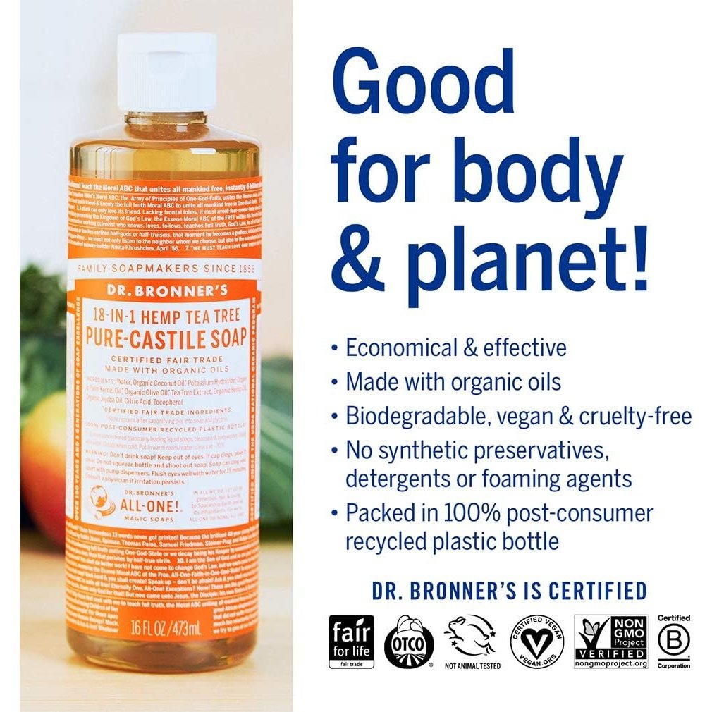 Dr. Bronner’s 18-in-1 Pure-Castile Soaps are good for just about any cleaning task. Face, body, hair – food, dishes, laundry, mopping, pets – clean your house and body with no synthetic preservatives, detergents or foaming agents – none!