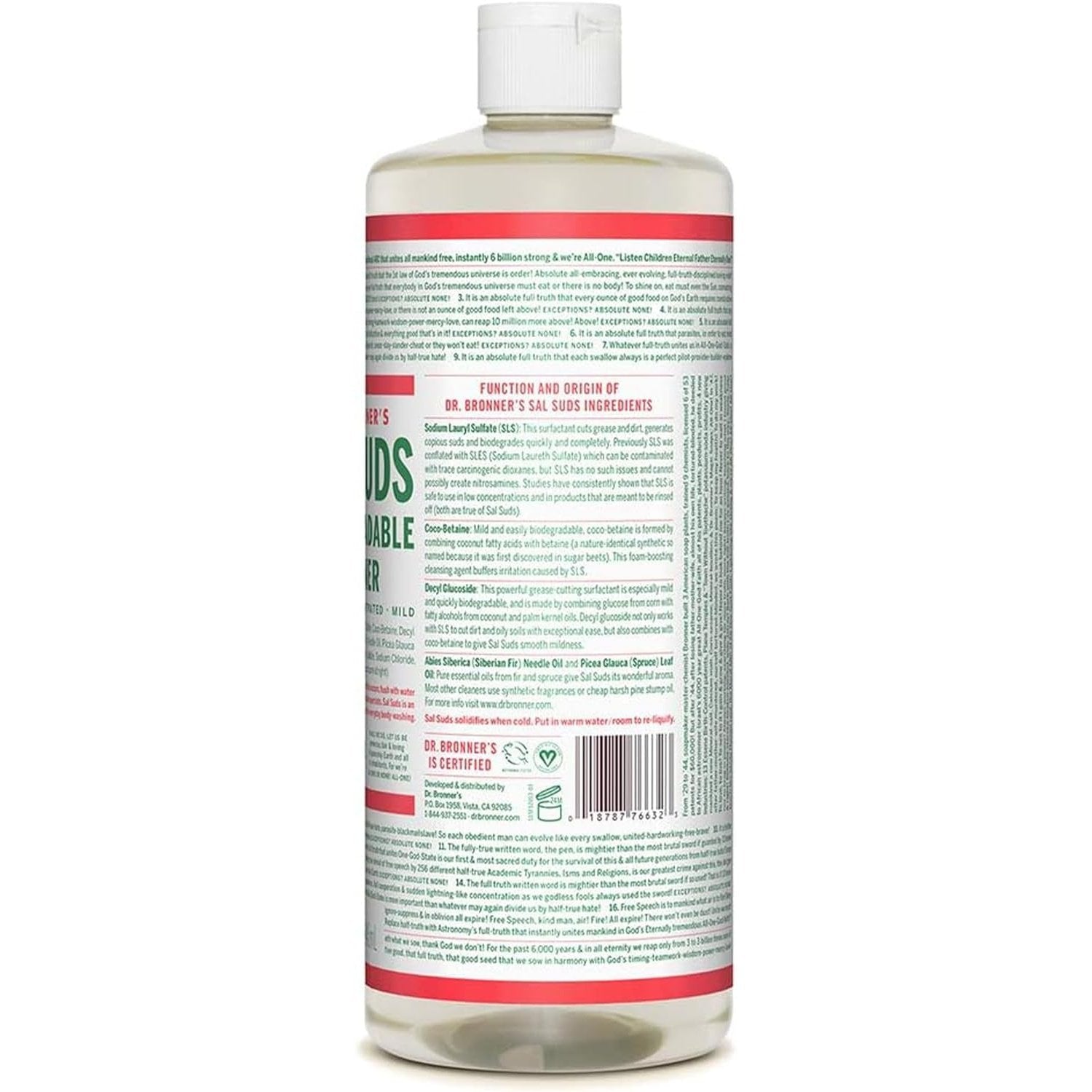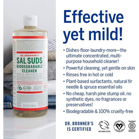 Dr. Bronner's Sal Suds Liquid Cleaner is not a soap but instead is a concentrated hard-surface all-purpose cleaner. It is made with plant-based surfactants and natural fir needle and spruce essential oils (no cheap, harsh pine stump oil), without any synthetic dyes, fragrances or preservatives. Perfect for general household cleaning (dishes, floors, laundry, etc.), it cleans and rinses with exceptional power, yet it is mild and gentle on the skin. Sal Suds Liquid Cleaner is equally effective in hard or soft water, rinsing freely, hot or cold. It is 100% cruelty-free, as certified by the Coalition for Consumer Information on Cosmetics, and it will biodegrade rapidly after doing its job.