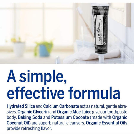 Introducing Dr. Bronner’s All-One Toothpaste with 70% organic ingredients! This low-foaming formula has no synthetic detergent foaming agents, is fluoride-free, vegan and cruelty-free, with no artificial colours, flavours, preservatives, or sweeteners – none! This simple yet effective toothpaste stimulates mouth, teeth, gums and tongue, leaving them fresh and clean. Made in a 100% recyclable box and tube. Available in peppermint, cinnamon and anise flavors.
