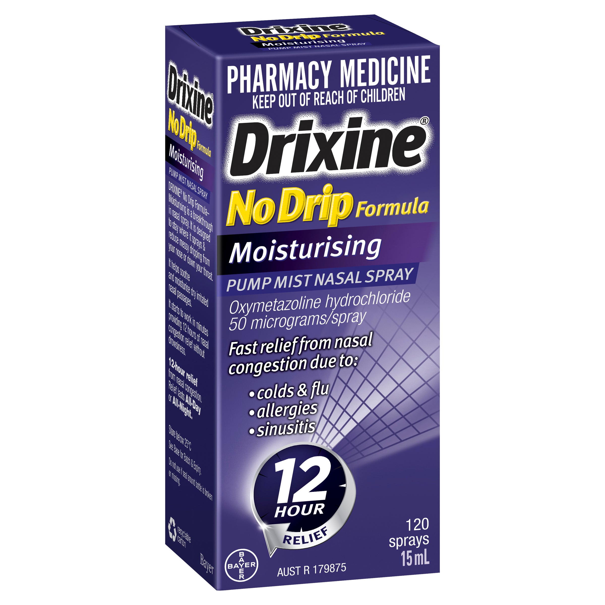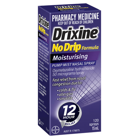 Drixine No Drip Moisturising Nasal Spray provides fast relief for up to 12 hours. It is non-drowsy and relieves nasal congestion due to colds & flu, sinusitis and allergies, including hay fever. It also helps moisturise dry nasal passages.