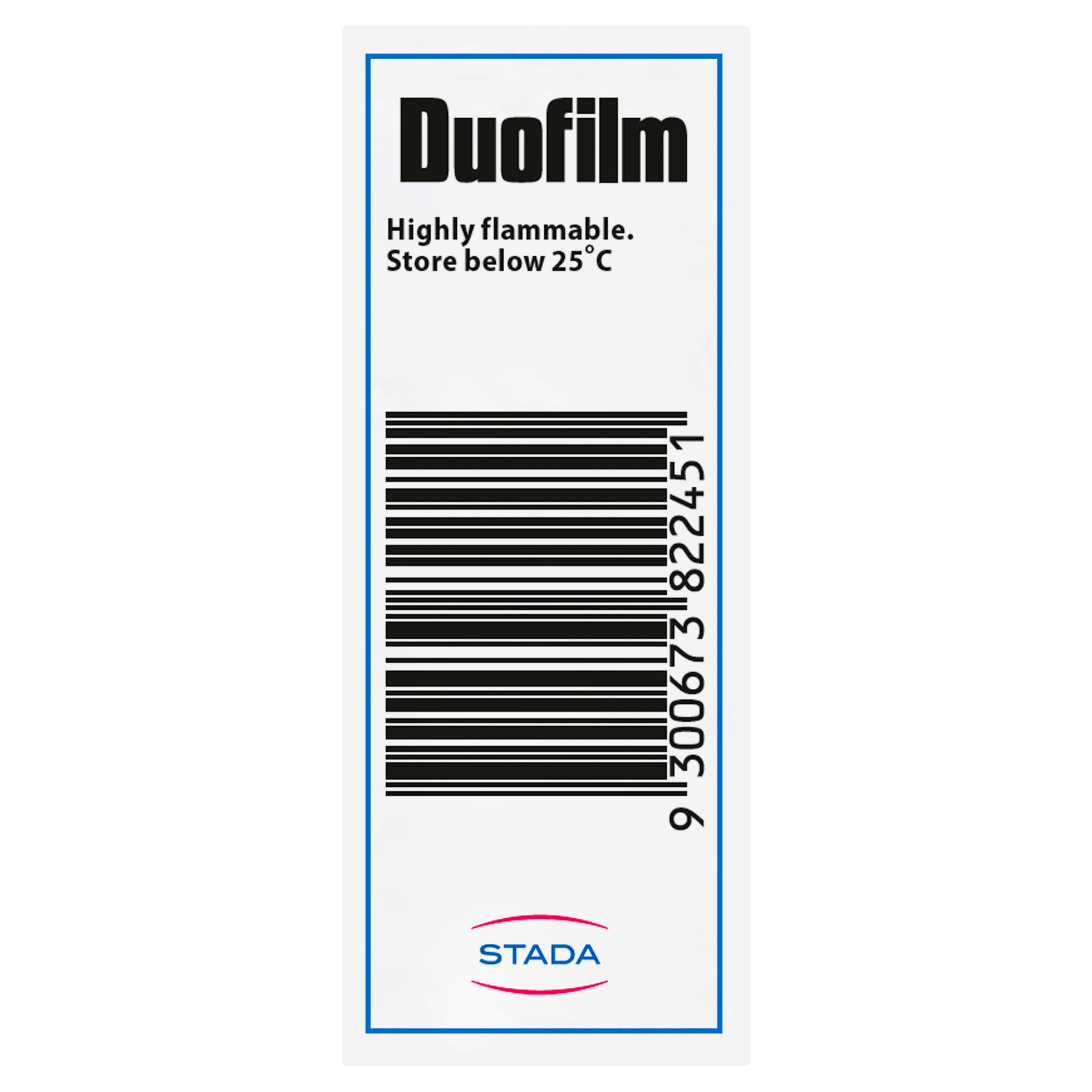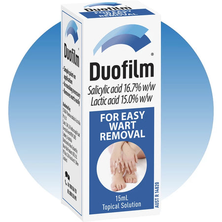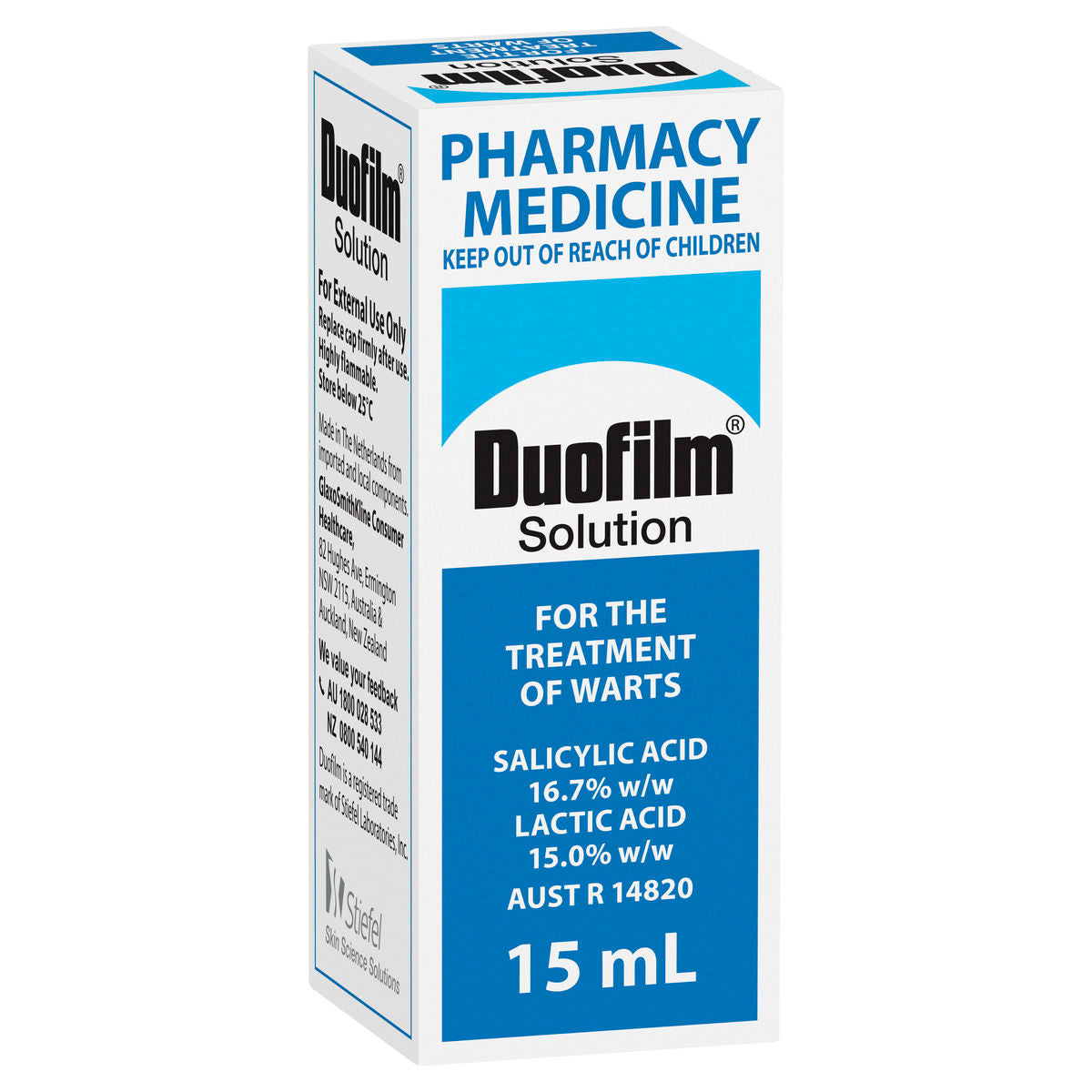 Duofilm is a medication for the topical treatment of warts. The 15 ml glass bottle, with brush applicator, contains the active ingredients salicylic acid (16.7 %) and lactic acid (15 %). Applied topically, salicylic acid acts on the surface layer of the skin to promote shedding (desquamation). Lactic acid suppresses the wart skin thickening process. The elastic colloidal film provides a viscous vehicle for accurate application and the penetration of active ingredients into warts. The lactic acid also forms a film that helps keep the skin moisturised, facilitating the elimination of warts.