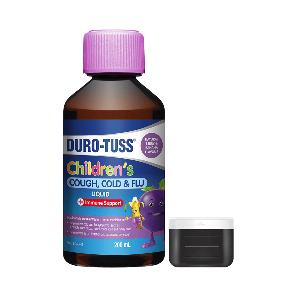 Duro-Tuss Children's Cold & Flu Liquid 2 Years+ helps relieve coughs, blocked noses, aches & pains, fever & sore throats + immunity booster.