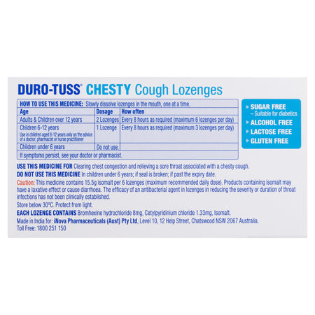 DURO-TUSS Chesty Cough Lozenges help to clear the chest and soothe a sore throat.