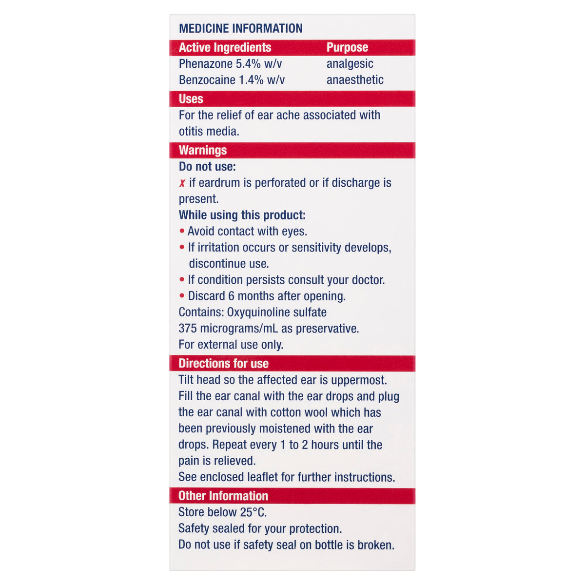 Ear Clear Ear Drops For Ear Ache Relief 15ml provides effective relief of ear pain associated with otitis media. It is specially formulated with benzocaine, a local anaesthetic and phenazone, an analgesic, to provide temporary relief of ear pain.