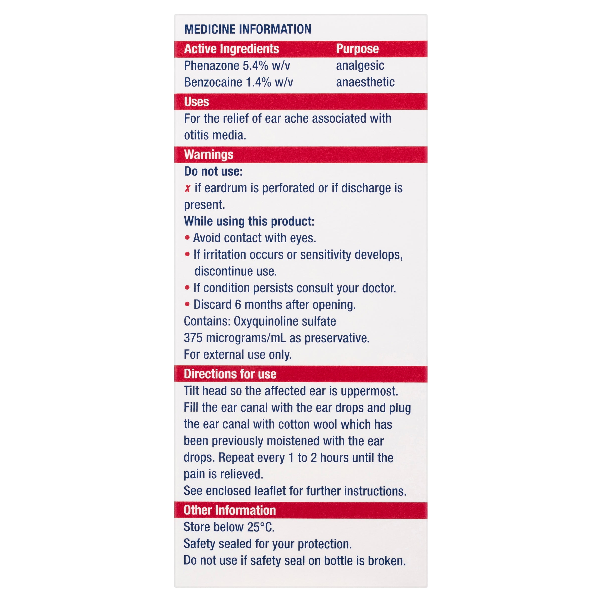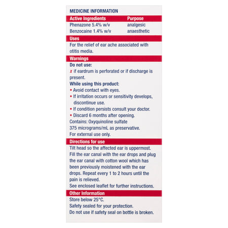 Clinical studies in patients with otitis media confirm that ear drops containing benzocaine and phenazone provide additional relief of pain within 30 minutes when used in conjunction with oral analgesics such as paracetamol*.