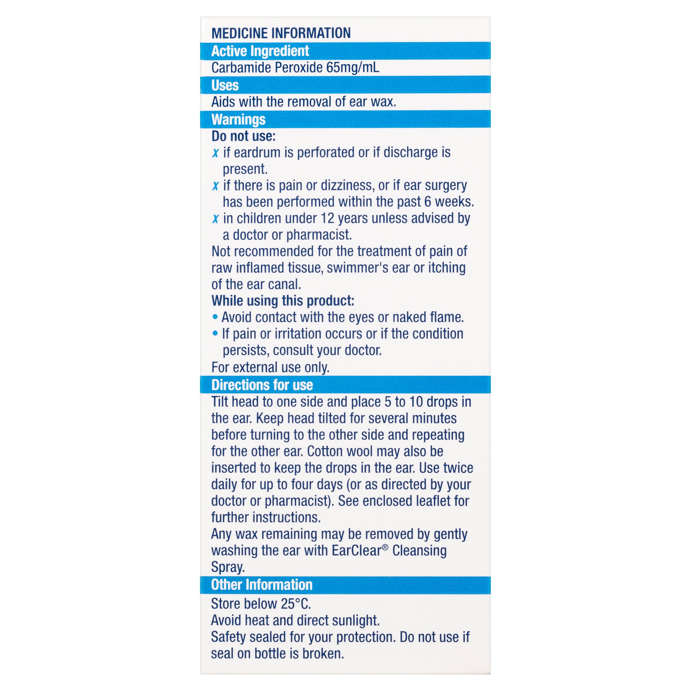 Contains carbamide peroxide which helps soften and loosen ear wax. This aids easy removal, may reduce the need for syringing, and also helps relieve ear wax discomfort.