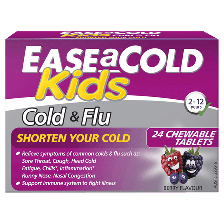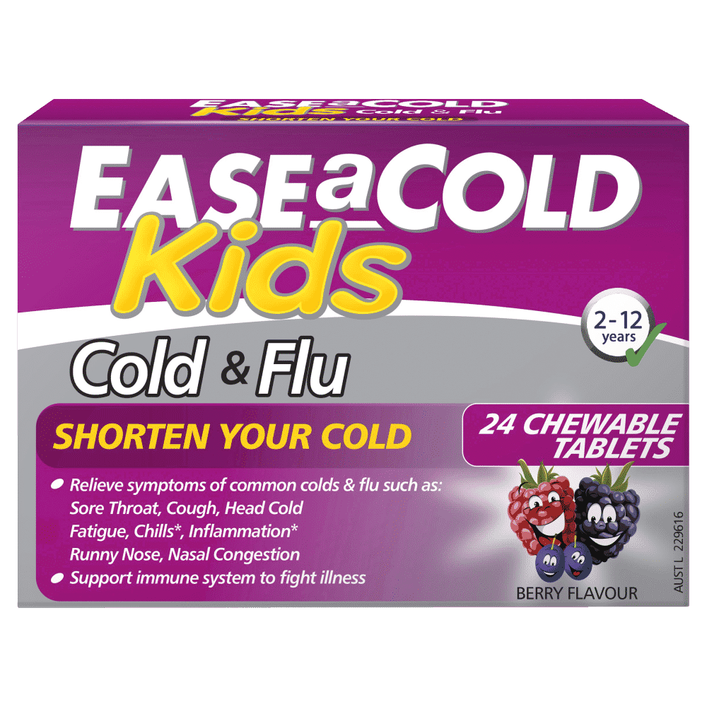 EASEaCOLD Kids Cold & Flu chewable tablets are specially formulated with Black Elderberry, Echinacea, Zinc, vitamin C, and bioflavonoids to help reduce the duration of common colds and relieve the severity of cold & flu symptoms including runny nose, sore throat, and congestion.