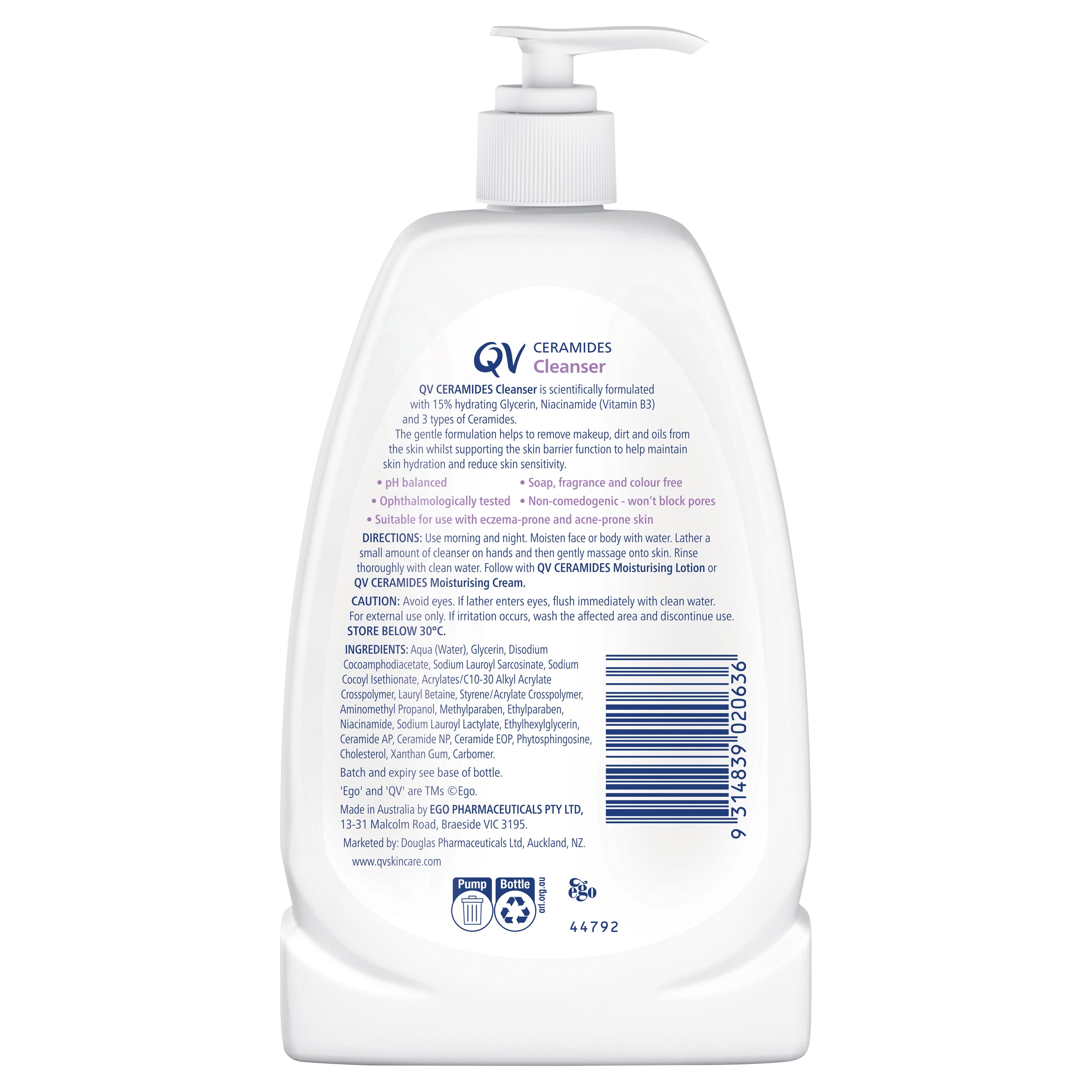 Use morning and night. Moisten your face or body with water. Lather a small amount of cleanser on your hands and then gently massage it onto the skin. Rinse thoroughly with clean water. Follow up with QV Ceramides Moisturising Lotion or QV Ceramides Moisturising Cream.