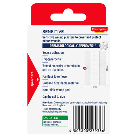 Elastoplast Sensitive plasters are extra skin-friendly and have been tested on easily irritated skin.. They are suitable for covering all types of smaller wounds such as cuts, scratches and grazes. Each plaster has a non-stick wound pad that provides the wound with cushioning and protectionKEY FEATURES