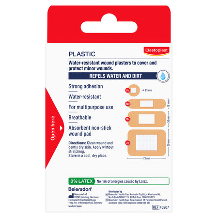 Elastoplast Plastic Water-Resistant Plasters Assorted are water-resistant and all-purpose, with strong adhesion.