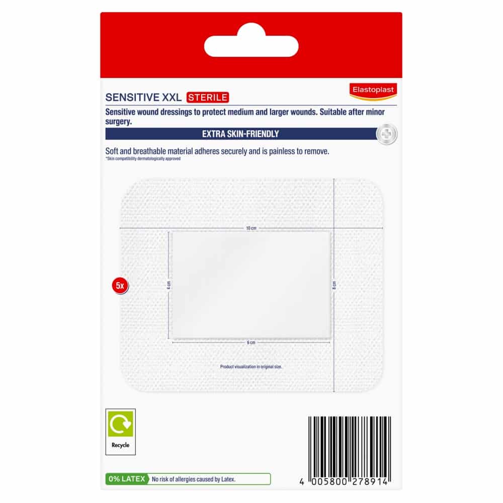 Elastoplast Sensitive XXL Dressings are sterile wound coverings for the protection of everyday larger wounds on those with sensitive skin types. With their skin-friendly, soft, and breathable material, they adhere securely yet are easy to remove. The extra-large and highly absorbent wound pad cushions your wound without sticking to it, providing high comfort during wear and has strong adhesion, keeping the dressing on through various types of conditions. The dressings are available in four different sizes, which seal all around the wound to help protect from contamination and infection: XL – 6cm x 7cm, XXL – 8cm x 10cm, 3XL - 10cm x 15cm and 4XL – 10cm x 20cm. Clean and dry the wound properly then apply the plaster without stretching to avoid creases and achieve best results. The dressing also contains 0% latex.Always read the label and follow the directions for use.