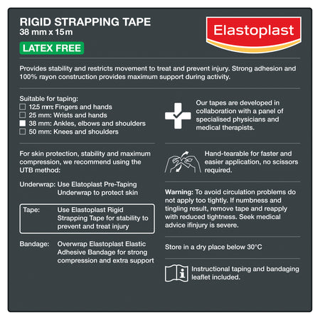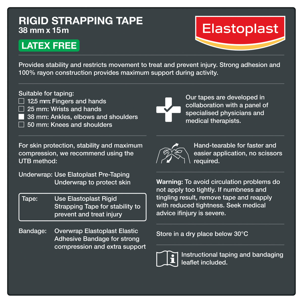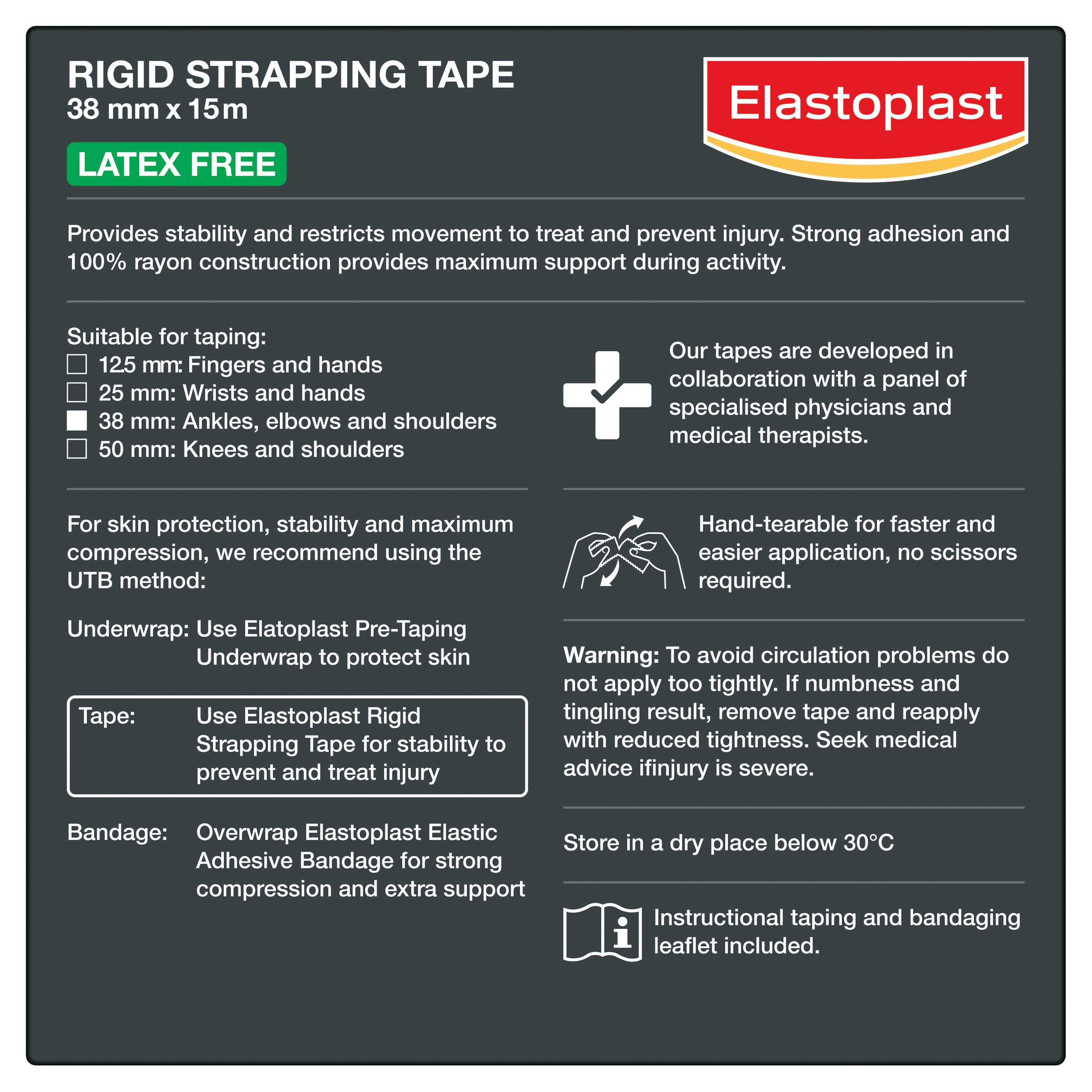 Elastoplast Rigid Strapping Tape is a robust supportive tape that stabilises joints during vigorous physical activity in all conditions. Effective in both preventative and rehabilitation taping techniques.