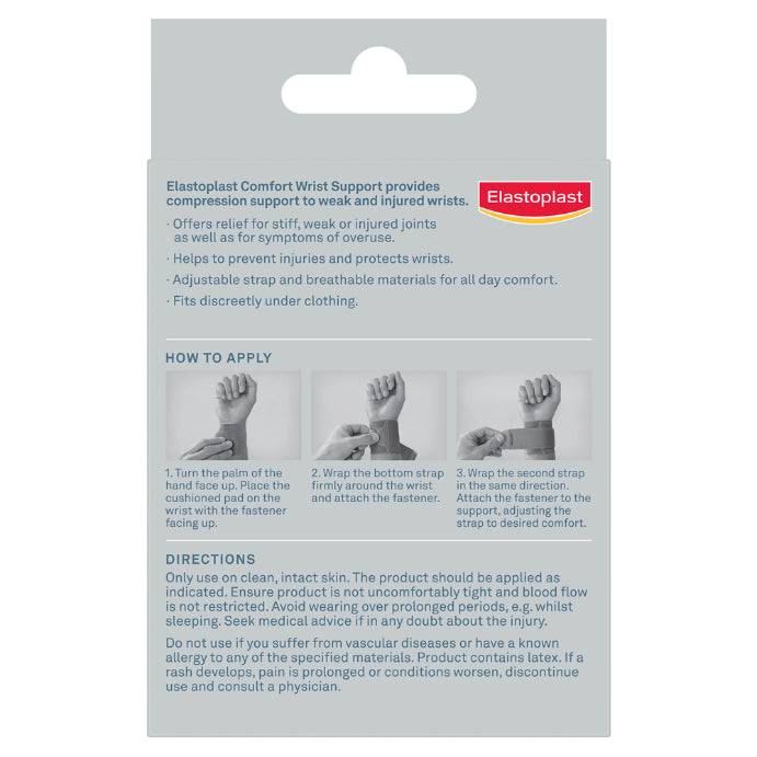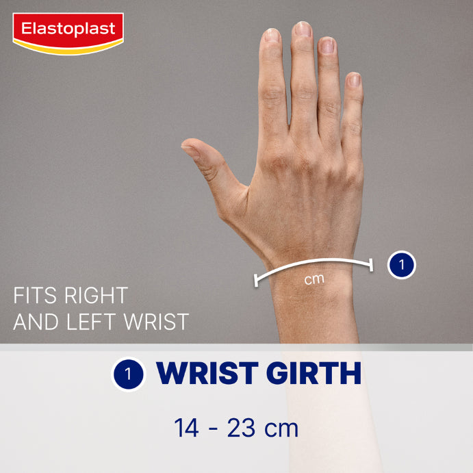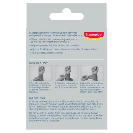Elastoplast Wrap Around Wrist Support (1 pack) stabilises and supports weak and injured wrists. Limits wrist motion and protects muscles, tendons and ligaments from re-injury or injury. The neoprene wrist support is soft and breathable and is adjustable to fit. This ensures long-term comfort and support for tender wrists. The slimline design can be worn under clothing on the left or right wrist. Ideal for relief from symptoms of carpel tunnel syndrome, tennis elbow, and other related ailments. To Fit Sizes Range: 14cm – 24cm Always read the label. Use only as directed. If symptoms persist consult your healthcare professional.KEY FEATURES