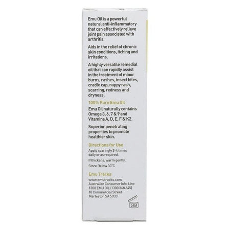 Emu Tracks Pure Emu Oil is 100% natural with no added preservatives. Pure Emu Oil is beneficial due to its powerful anti-inflammatory properties and superior penetrating properties that allow the oil to penetrate the stratum corneum barrier (outer layer of skin). It is a natural source of Omega 3, 6, 7 & 9 and essential fatty acids that are not produced by the human body but are essential for good health and well-being.