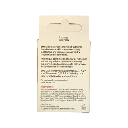 Emu Oil, Cocoa Butter, Beeswax, Almond Oil (Prunus Amygdalus Dulcis), Shea Butter (Butyrospermum Parkii), Carnauba Wax (Copernicia Cerifera), St John’s Wort (Hypericum Perforatum), Rosehip Oil (Rosa Rubiginosa), Wheatgerm Oil (Triticum Vulgare), Vitamin E (Tocopherol), Orange Oil (Citrus Aurantium Dulcis).