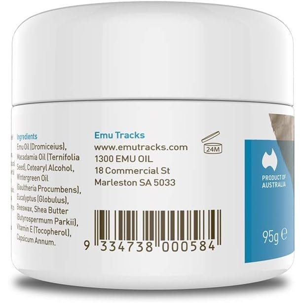 Emu Oil (Dromiceius), Macadamia Oil (Ternifolia Seed), Cetearyl Alcohol, Wintergreen Oil (Gaultheria Procumbens), Eucalypus (Globulus), Beeswax, Shea Butter (Butyrospermum Parkii), Vitamin E (Tocopherol), Capsicum Annum.Apply to effected area 2 – 3 times daily.