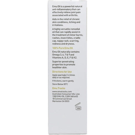 Emu Tracks Pure Emu Oil is 100% natural with no added preservatives. Pure Emu Oil is beneficial due to its powerful anti-inflammatory properties and superior penetrating properties that allow the oil to penetrate the stratum corneum barrier (outer layer of skin). It is a natural source of Omega 3, 6, 7 & 9 and essential fatty acids that are not produced by the human body but are essential for good health and well-being.