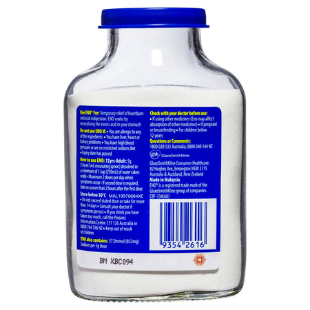 Eno is an antacid powder which is mixed with water to produce a sparkling antacid drink for the temporary relief of heartburn & acid indigestion caused by too much food and/or drink.