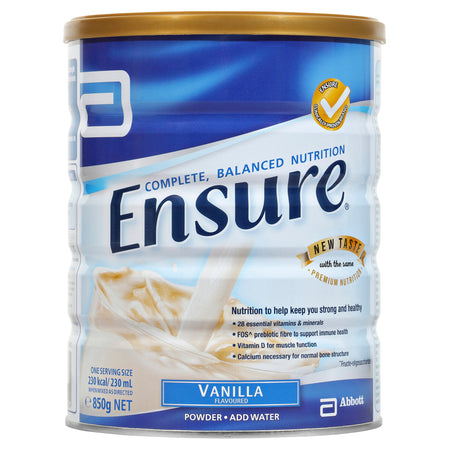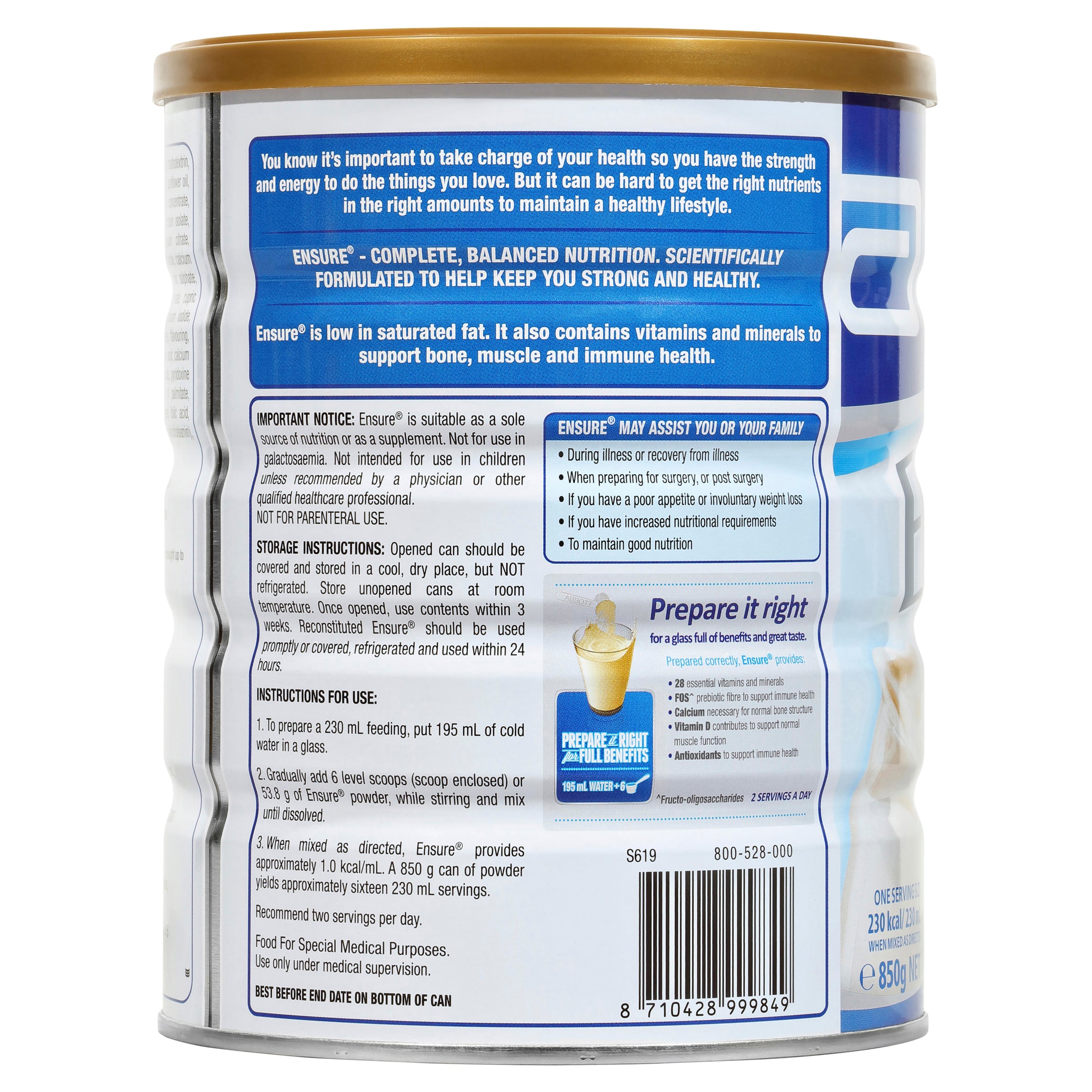 To prepare a 230ml serving, put 195ml of cold water into a glass. Gradually add 6 level scoops (scoop in the can) or 53.8g of Ensure Powder and stir until dissolved. A 850g can of powder yields approximately 16 x 230mL servings.