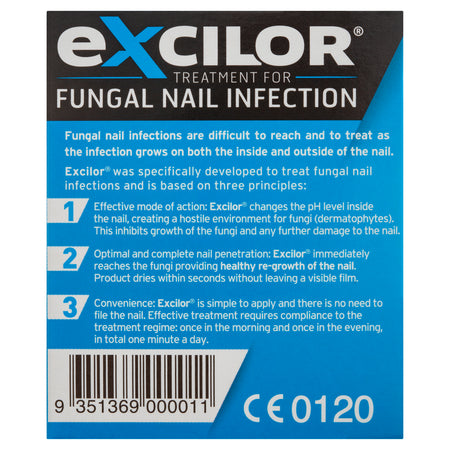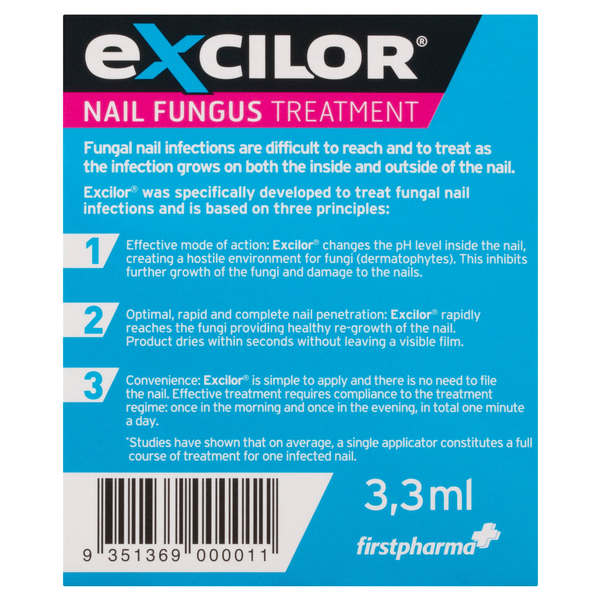 Excilor comes in an easy-to-use solution applicator, requiring 1 minute a day to apply. Clinically proven efficacy for the treatment of onychomicosis (nail fungus). Complete penetration through TransActive penetration technology. NO NEED TO FILE THE NAIL.