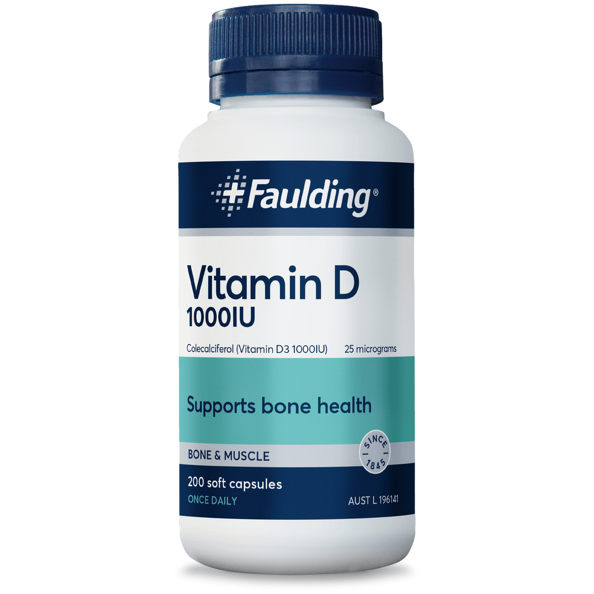 Faulding® Vitamin D 1000IU aids in the absorption of calcium which supports the development and maintenance of strong, healthy bones. Vitamin D is mainly produced in our skin by a reaction that requires sunlight. People who limit their exposure to sunlight may have an increased need for vitamin D supplementation. Faulding® Remedies Vitamin D 1000IU may also assists with calcium absorption.