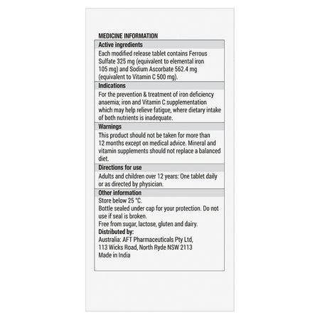 Each modified-release tablet contains Ferrous Sulfate 325mg (equivalent to elemental iron 105mg) and Sodium Acerbate 562.4mg (equivalent to vitamin C 500mg).