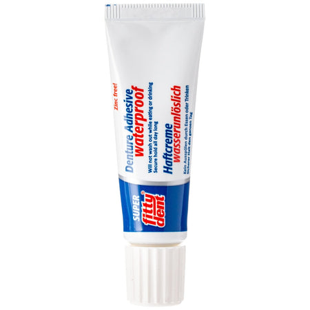Fittydent Super is the only denture adhesive worldwide which is waterproof, thus not washed out while eating and drinking. It provides an extremely strong hold and assures that the denture will stay fixed to the gum all day long. fittydent Super Denture Adhesive Cream gives you the freedom and confidence to speak and laugh freely all day long, and helps you to eat and drink without worry or embarrassment.