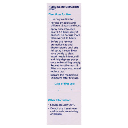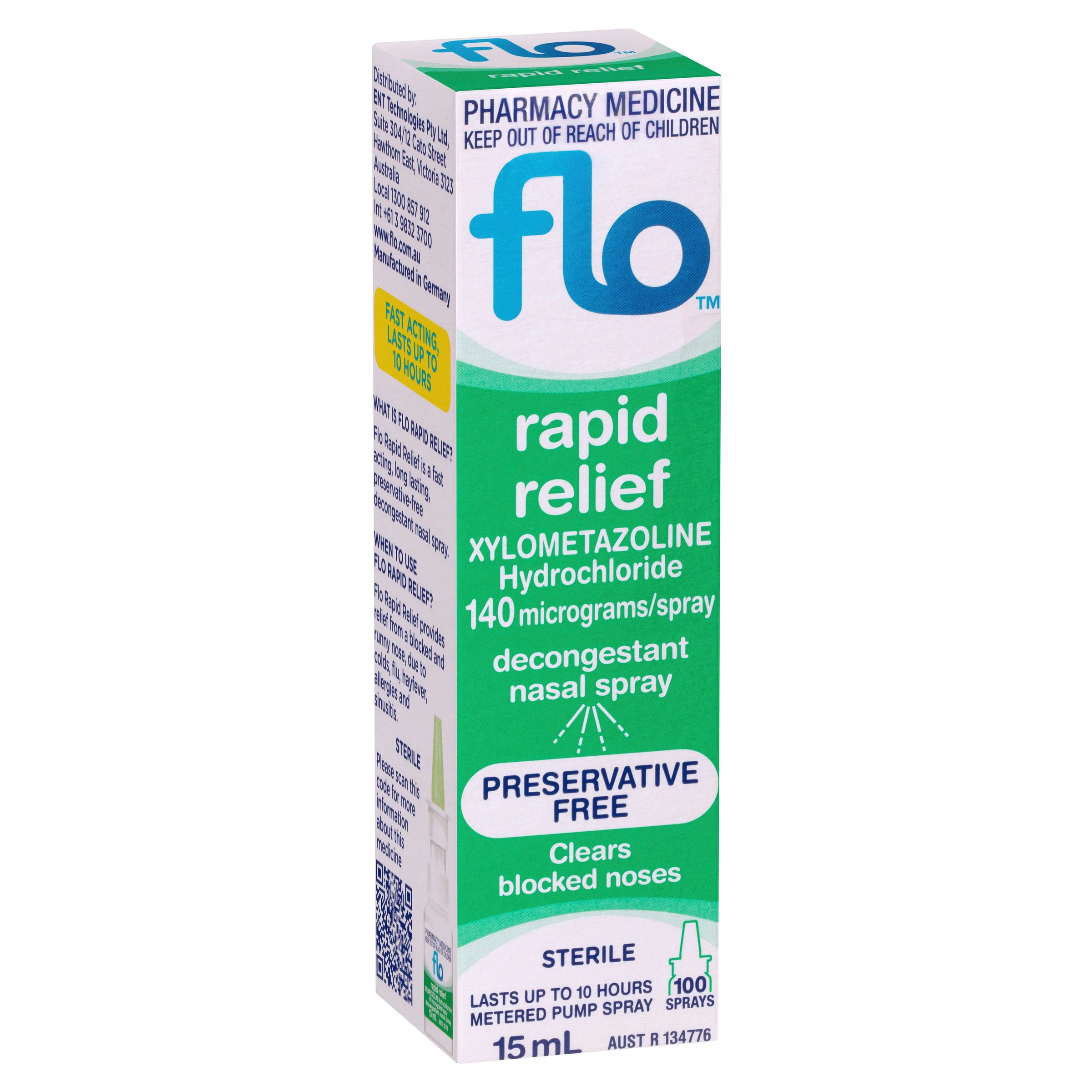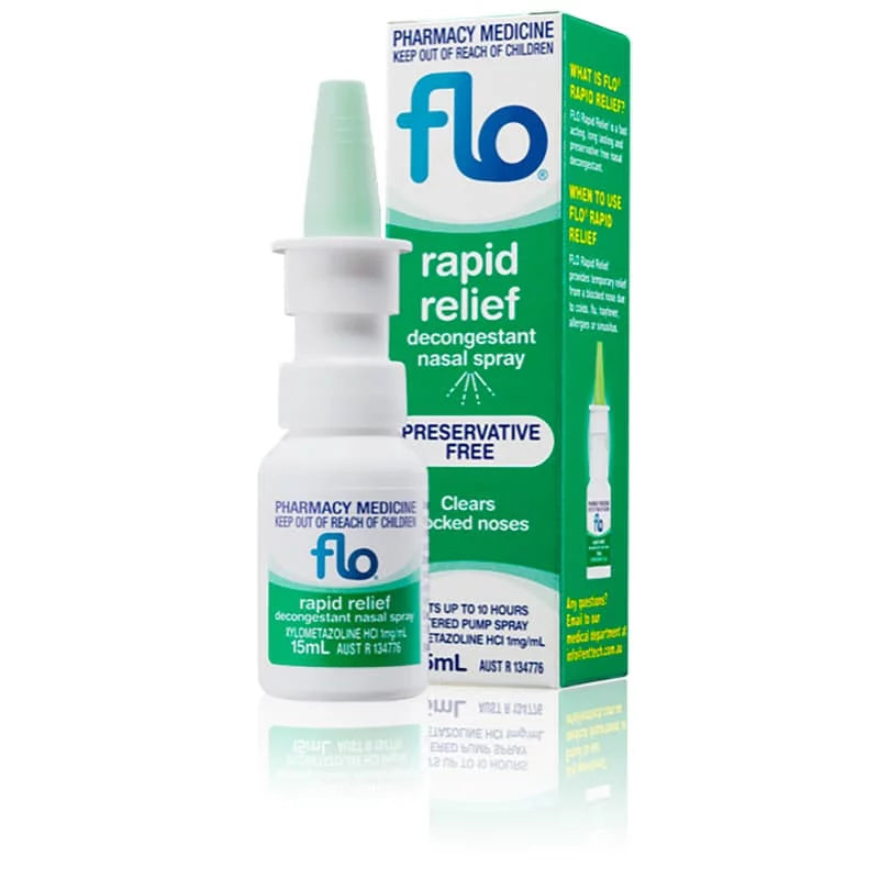 FLO Rapid Relief contains the active ingredient Xylometazoline Hydrochloride (1mg/mL) which acts quickly to reduce congestion and lasts for up to 10 hours. Because it's medicated, only use it strictly as directed and consult your physician if symptoms persist.