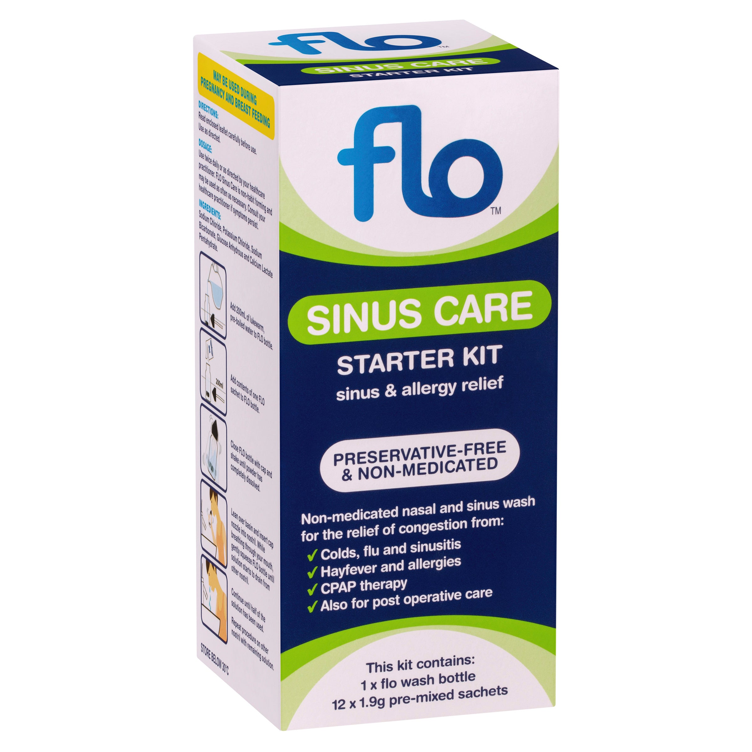 FLO Sinus Care is a non-medicated, preservative-free, isotonic irrigation solution for washing the nasal passages and sinus cavities. It's gentle to use and helps thin mucus and clear irritants to relieve congestion.