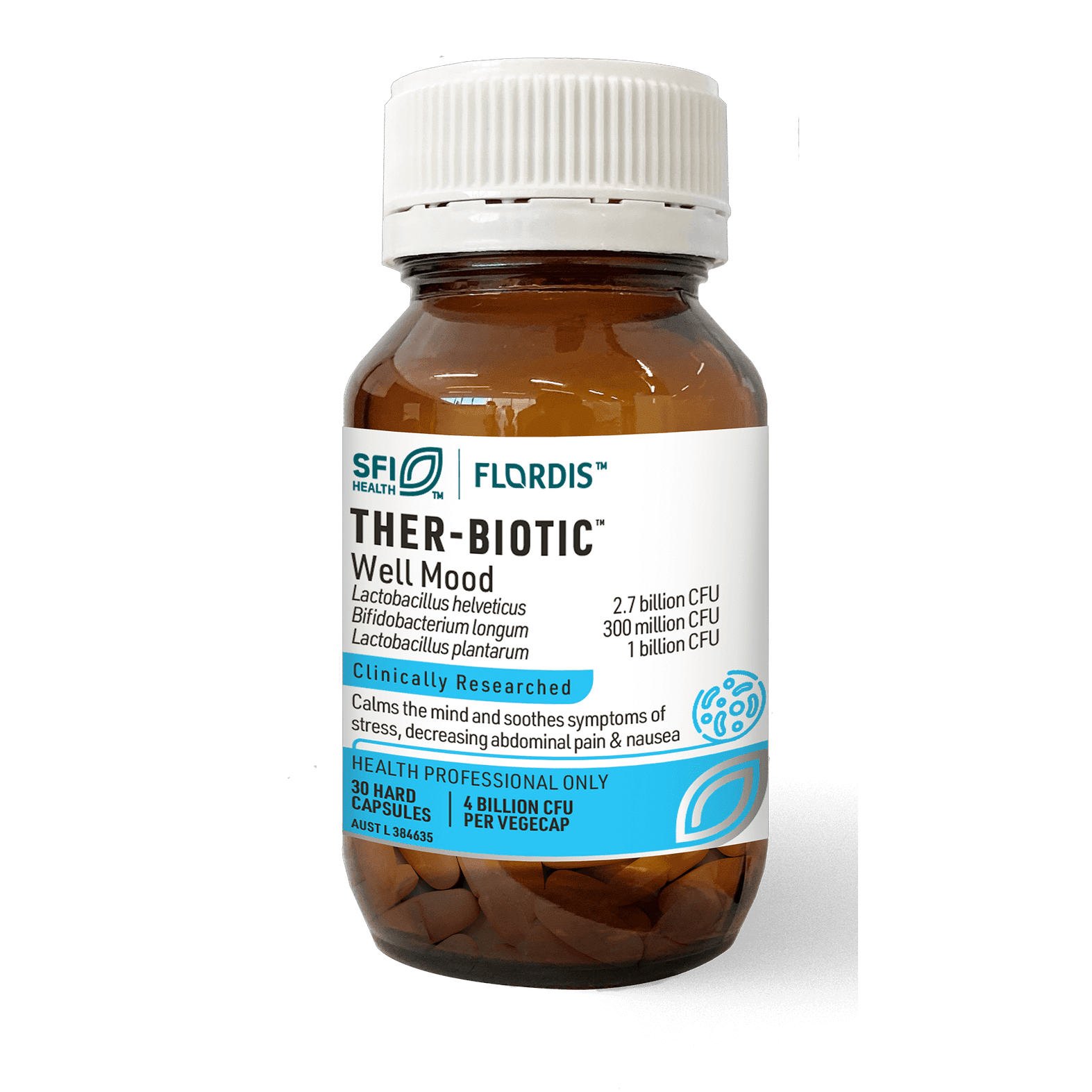 Ther-biotic Well Mood has 3 probiotic strains that help reduce symptoms of mild anxiety, support healthy mood balance and relieve abdominal symptoms caused by stress such as abdominal pain and nausea.