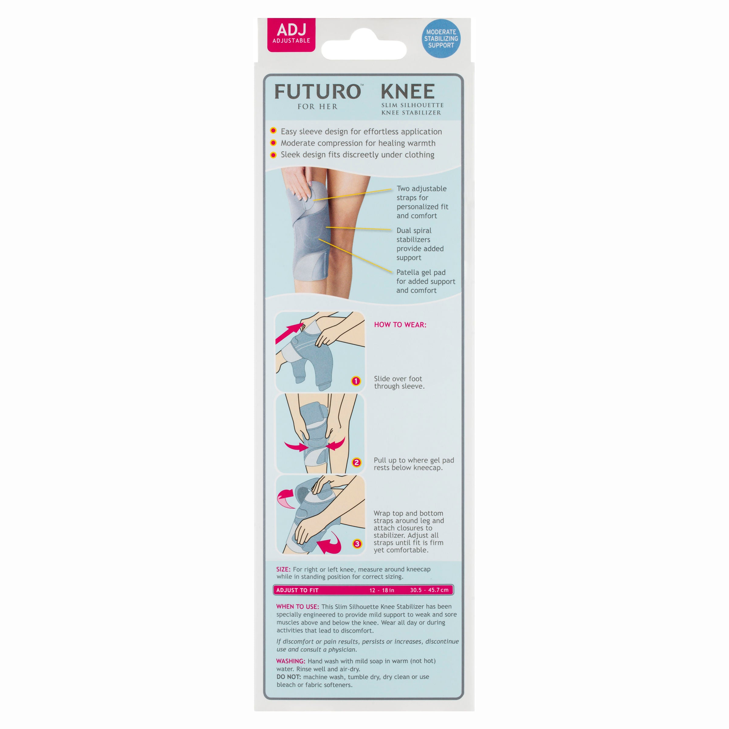 Helps provide mild support to weak and sore muscle above and below the knee. Wear all day or during activities that lead to discomfort. Contoured to fit the natural curves of a woman's leg. Two adjustable straps for personalised fit and comfort. Dual spiral stabilisers on each side of the knee provide added support.