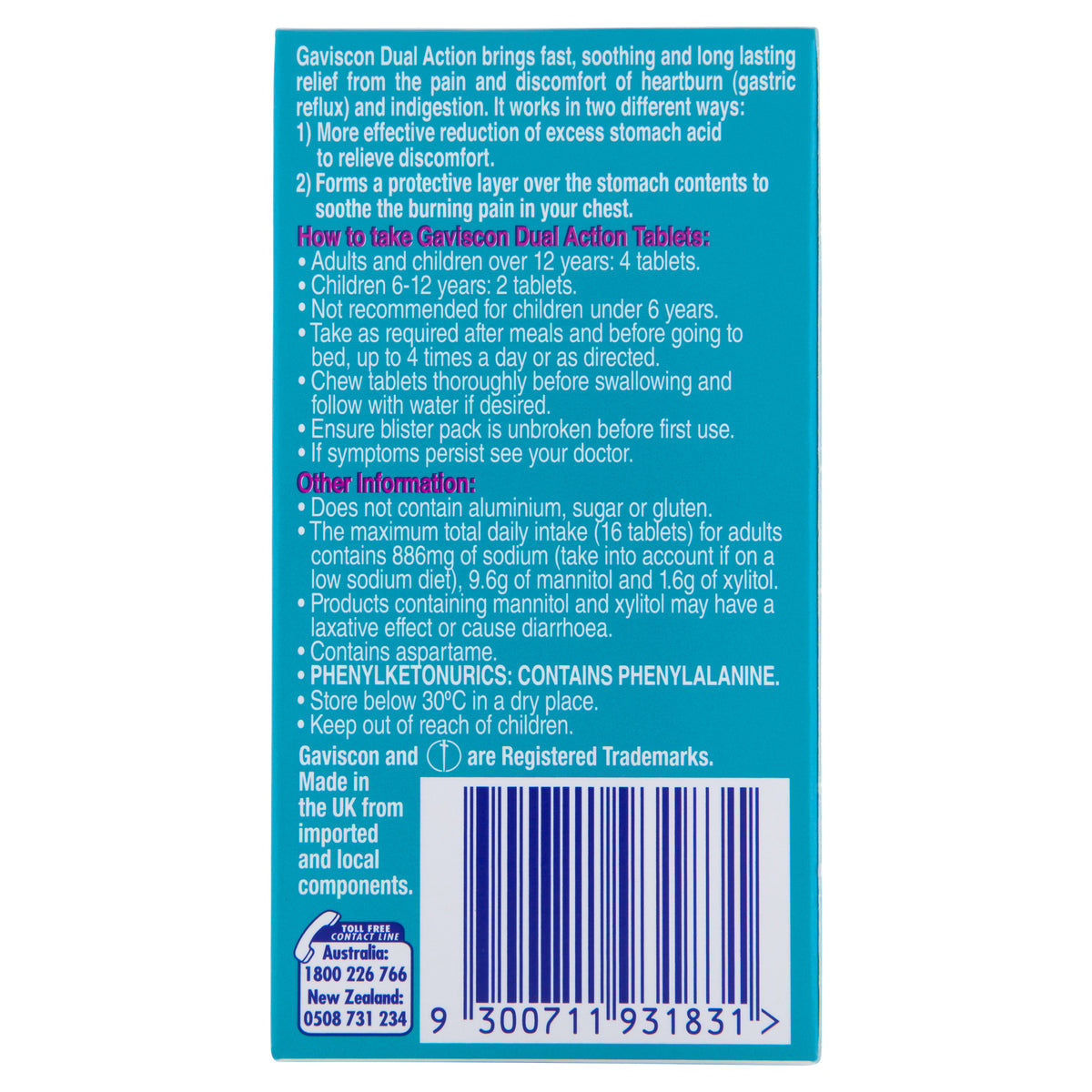 Gaviscon Dual Action Peppermint Tab X 32 works in two ways to effectively relieve symptoms of both heartburn and indigestion: