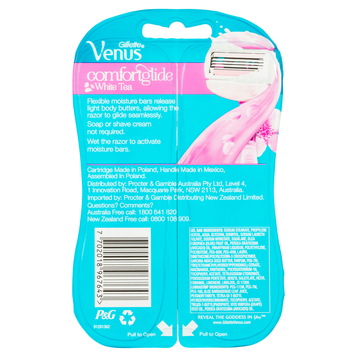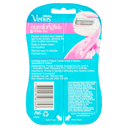Venus Comfortglide White Tea women's razors feature 3 curve hugging blades for a smooth, close shave that lasts. The razor blade refills come equipped with built in flexible gel bars that, when wet, release rich white tea scented body butter lather for glide and comfort. No need for shave gel. Gillette Venus Comfortglide women's razors feature an adaptive, pivoting design that adjusts to your body's contours and a rounded head that hugs curves and fits easily into hard to shave areas. No awkwardly angling your razor. This razor's handle is also made with up to 30% recycled plastic. Any Venus blade refill fits any Venus razor handle (except Simply Venus 3 and Venus Pubic Hair Razor).