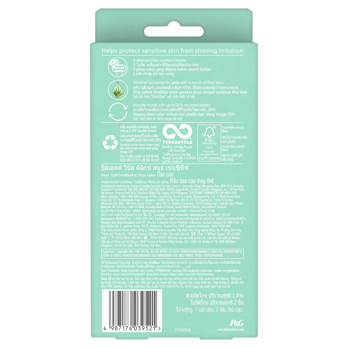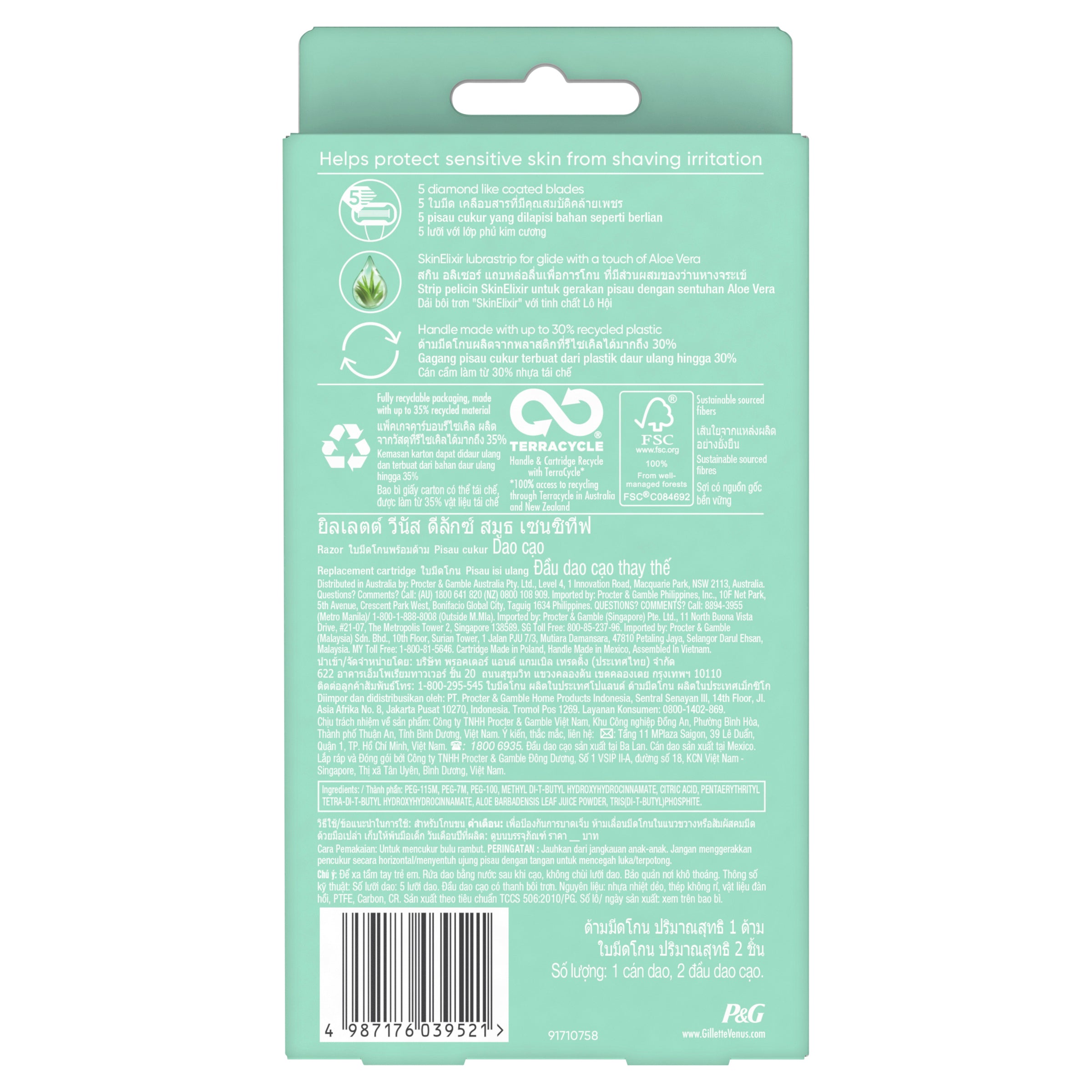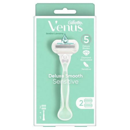 Gillette Venus Deluxe Smooth Sensitive women's razor blade refills provide up to 100% smoothness for sensitive skin. Featuring 5 diamond-like coated blades for a long-lasting smooth shave and a SkinElixir lubrastrip for glide that releases a perfect dose of protection from nicks, cuts and irritation while shaving. Its pivoting head adjusts to your curves, including ankles and knees. No awkwardly angling your razor. Designed with a soft-grip gel to comfortably fit your hands and made with 30% Post-Consumer Recycled plastic. Each blade refill lasts up to one month (based on twice/week shave); just use and replace when you're ready for a new one. Any Venus blade refill fits any Venus razor handle (except Simply Venus 3 and Venus Pubic Hair Razor).