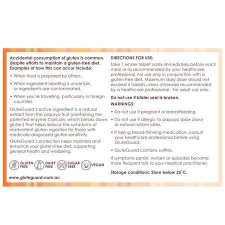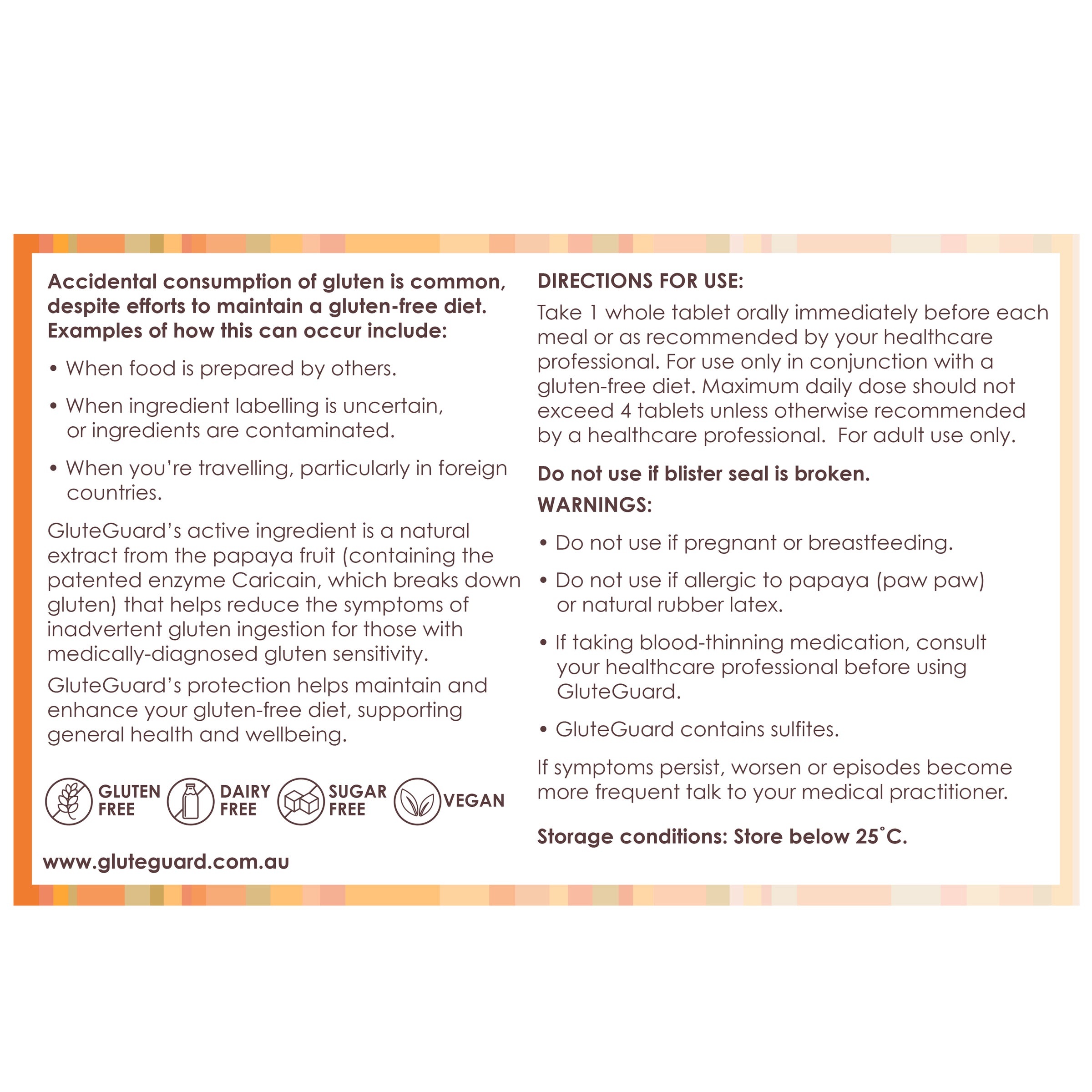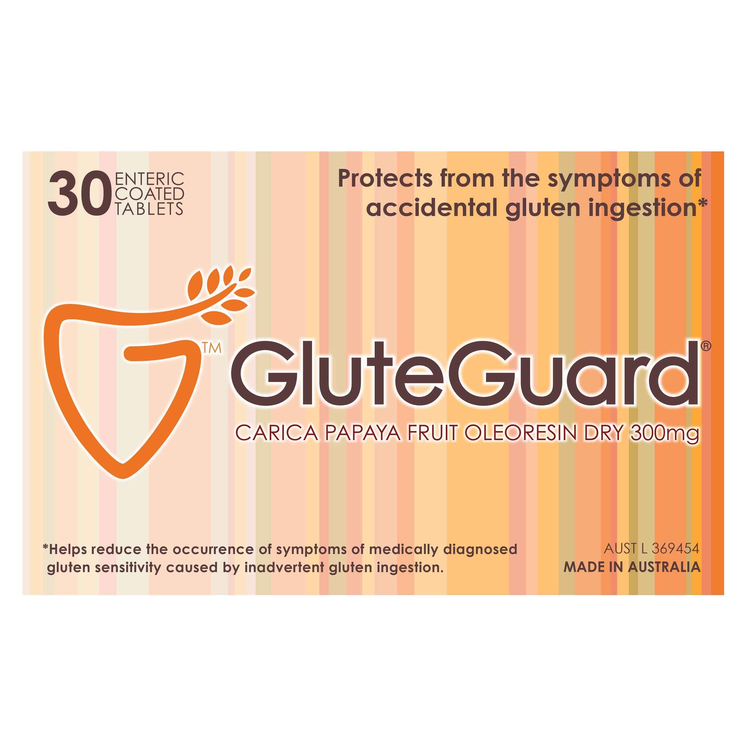 GluteGuard's active ingredient is a natural extract from the papaya fruit that helps reduce the symptoms of inadvertent gluten ingestion for those with medically diagnosed gluten sensitivity. GluteGuard's protection helps maintain and enhance your gluten-free diet, supporting general health and wellbeing.