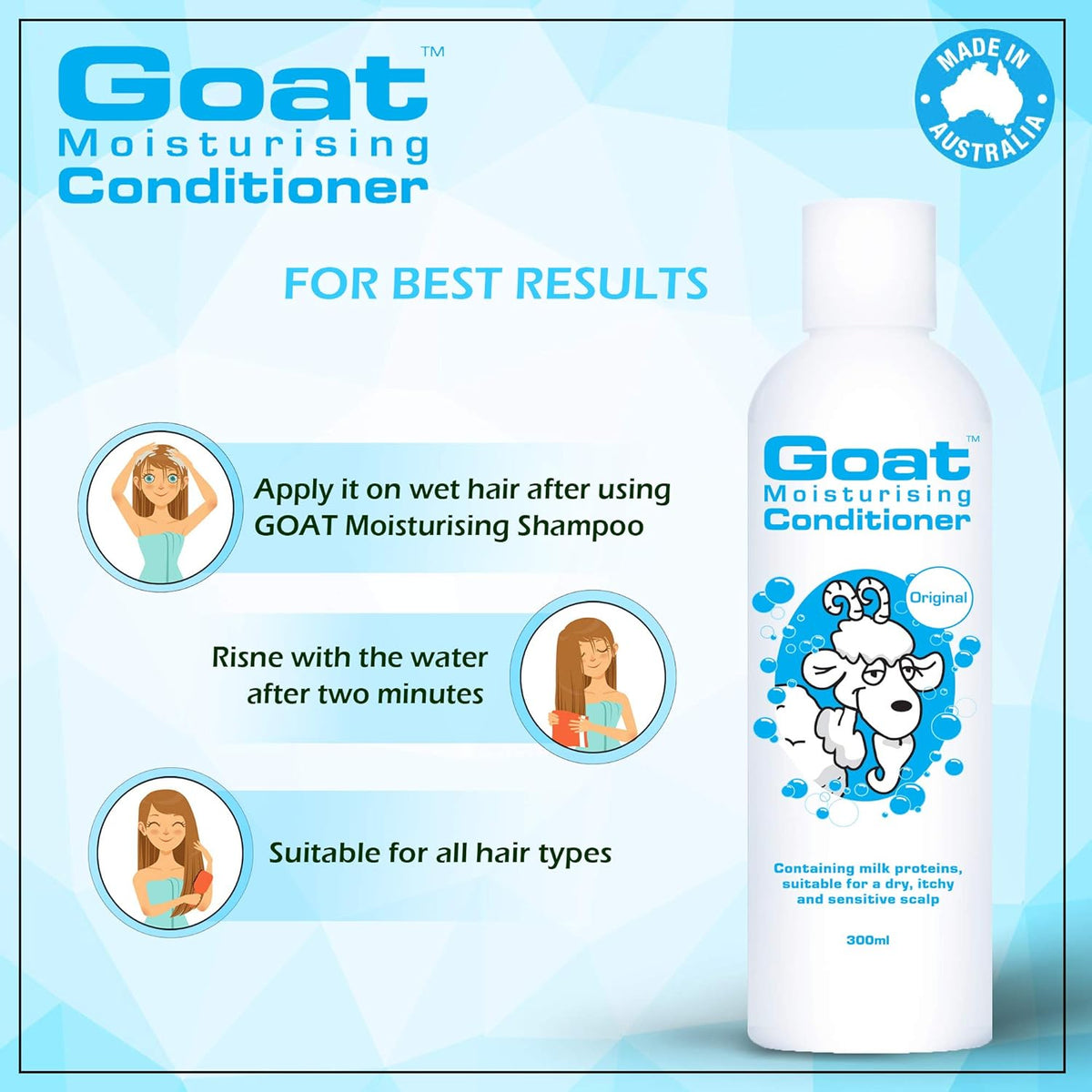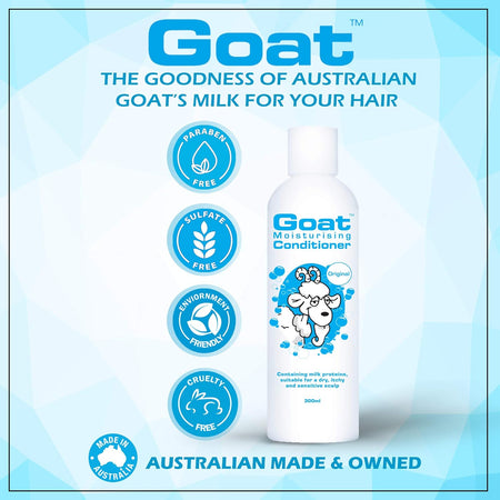 Apply to wet hair after using Goat Moisturising Shampoo. Massage into scalp and leave for 2 minutes then rinse thoroughly. Suitable for all hair types for everyday use.