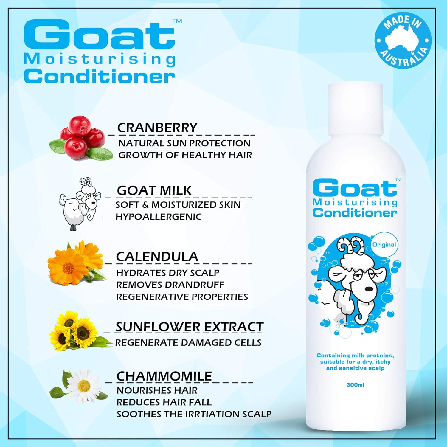 Aqua (Purified Water), Cetearyl Alcohol, Glycerin, Goat Milk (Caprae Lac), Behentrimonium Chloride, Heptyl Undecylenate, Phenoxyethanol, Parfum (fragrance), Guar Hydroxypropyl Trimonium Chloride, Panthenol, Potassium Sorbate, Polysorbate 20, Vaccinium Macroarpon (Cranberry) Extract, Calendula Officinalis Extract, Helianthus annuus seeds oil, Chamomilla Recutita Extract, Borago Officinalis oil, Tocopherol, Citric Acid.