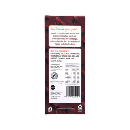 Googys Good Choc+ Dark is a smooth, rich and decadent premium chocolate with well-balanced cocoa, vanilla and coconut notes. Googys Dark Chocolate has classic bitter notes and the full complex flavour of high cocoa chocolate.