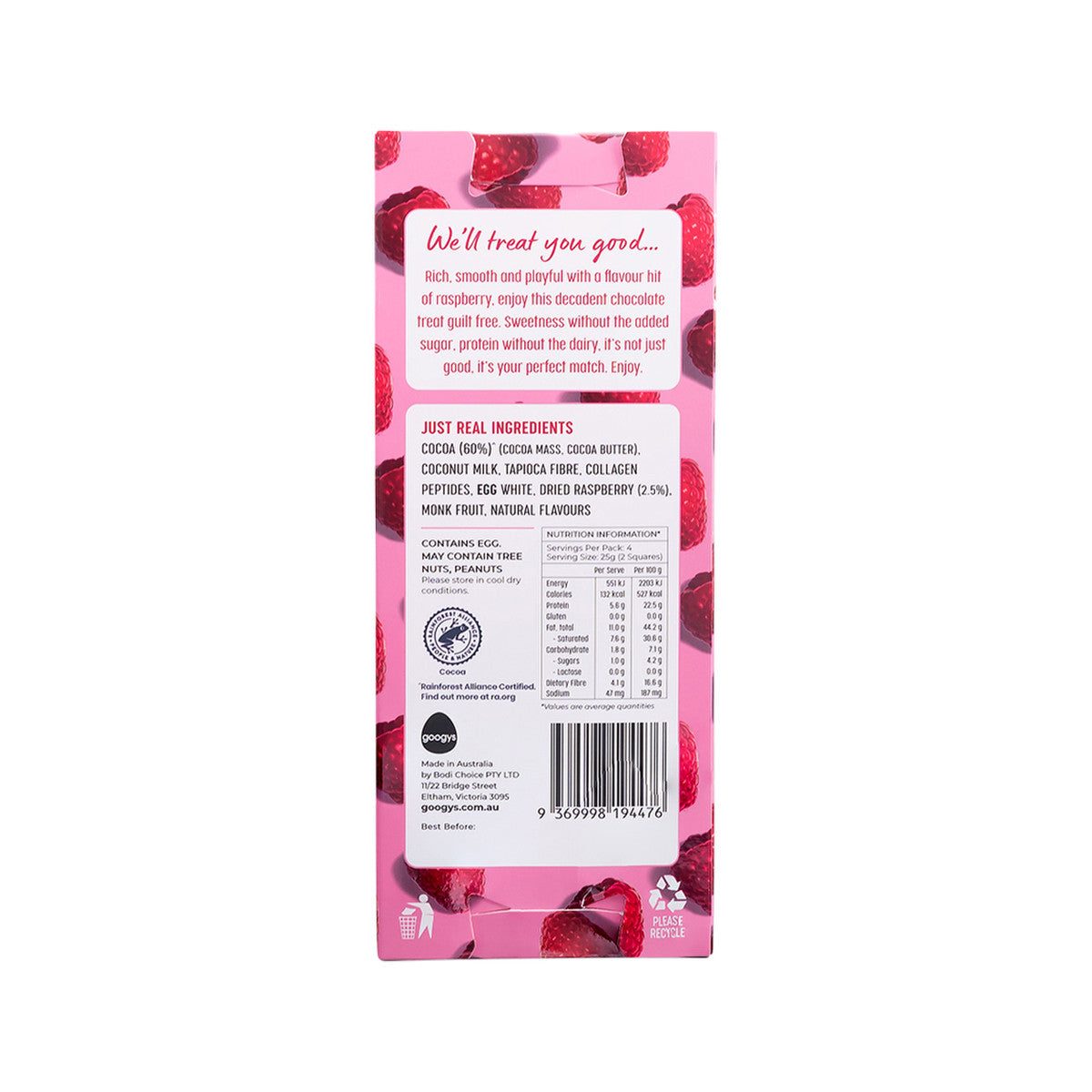 Googys Good Choc+ Dark Raspberry is a rich, smooth and playful premium chocolate with well-balanced cocoa, vanilla and coconut notes. With the fruity and tangy flavour hit of pure dried 100% Australian raspberries.