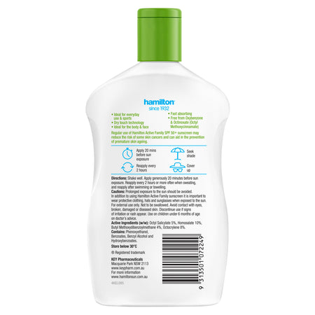 Warnings : In addition to using Hamilton Active Family sunscreen it is important to wear protective clothing, wide brimmed hats and sunglasses when exposed to the sun. These measures can help reduce the risk of skin cancer and premature ageing. Always read the label. Follow the directions for use.