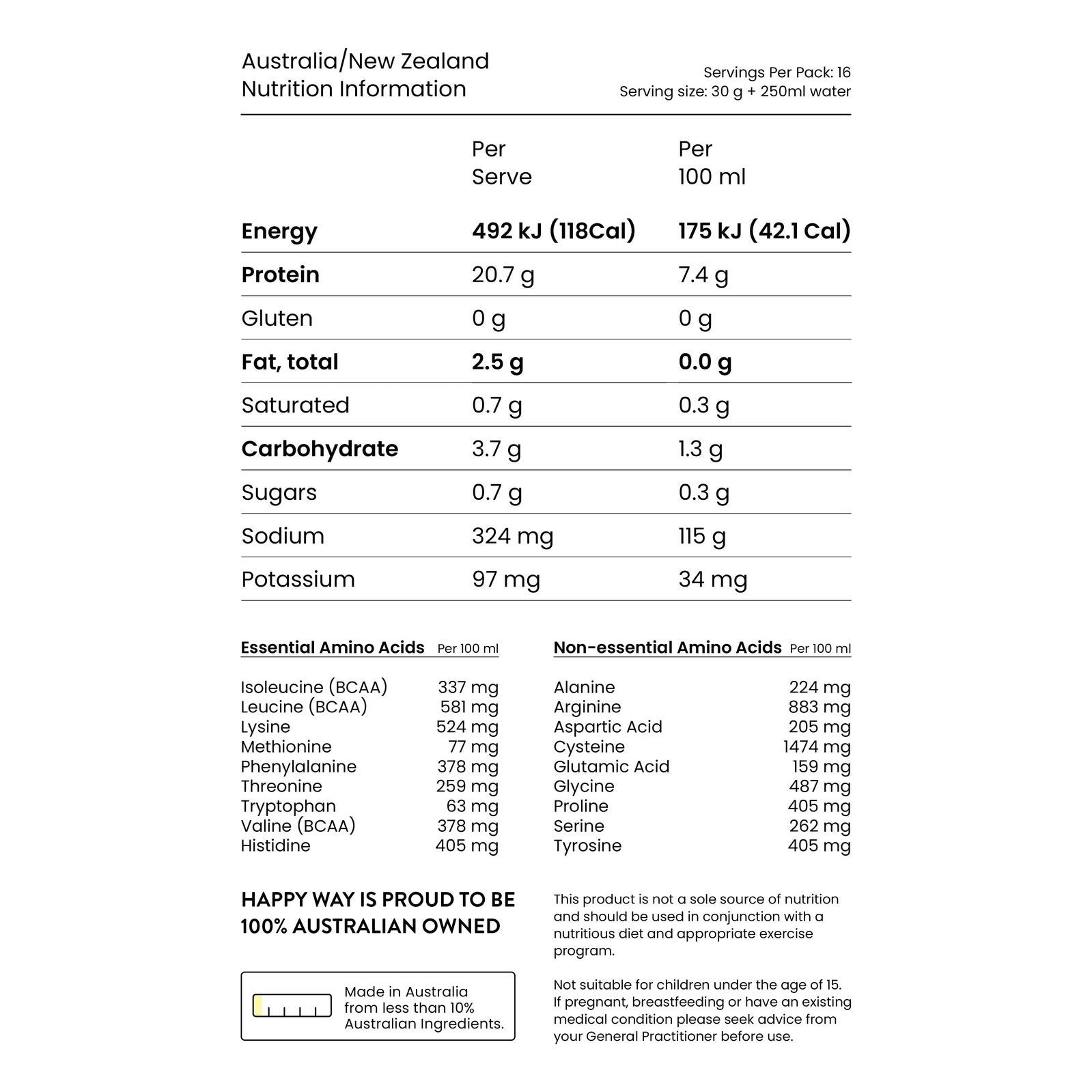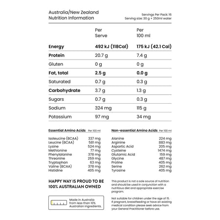 Pea Protein Isolate, Rice Protein Isolate, Organic Cacao, Organic Cocoa, Natural Flavour, Organic Coconut Flour, Chia Seeds, Psyllium Husk, Organic Maca Powder, Himalayan Rock Salt, Organic Stevia, Thaumatin.