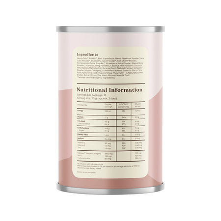 Hemp Gold® Protein*, Red Superfoods Blend (Beetroot Powder*, Acai Juice Powder*, Blueberry Juice Powder*, Tart Cherry Powder, Pomegranate Juice Powder*, Strawberry Juice Powder, Maqui Berry Powder*, Acerola Cherry Powder), Coconut Milk Powder* (Coconut Milk, Tapioca Maltodextrin, Acacia Gum), Natural Flavour, Vollagen® Powder (Vegan Collagen), Sunflower Lecithin, Bamboo Silica, Citric Acid Hyaluronic Acid (Vegan), Silica, Thaumatin – A Naturally Sweet Protein Extract From The West African Katemfe Fruit.