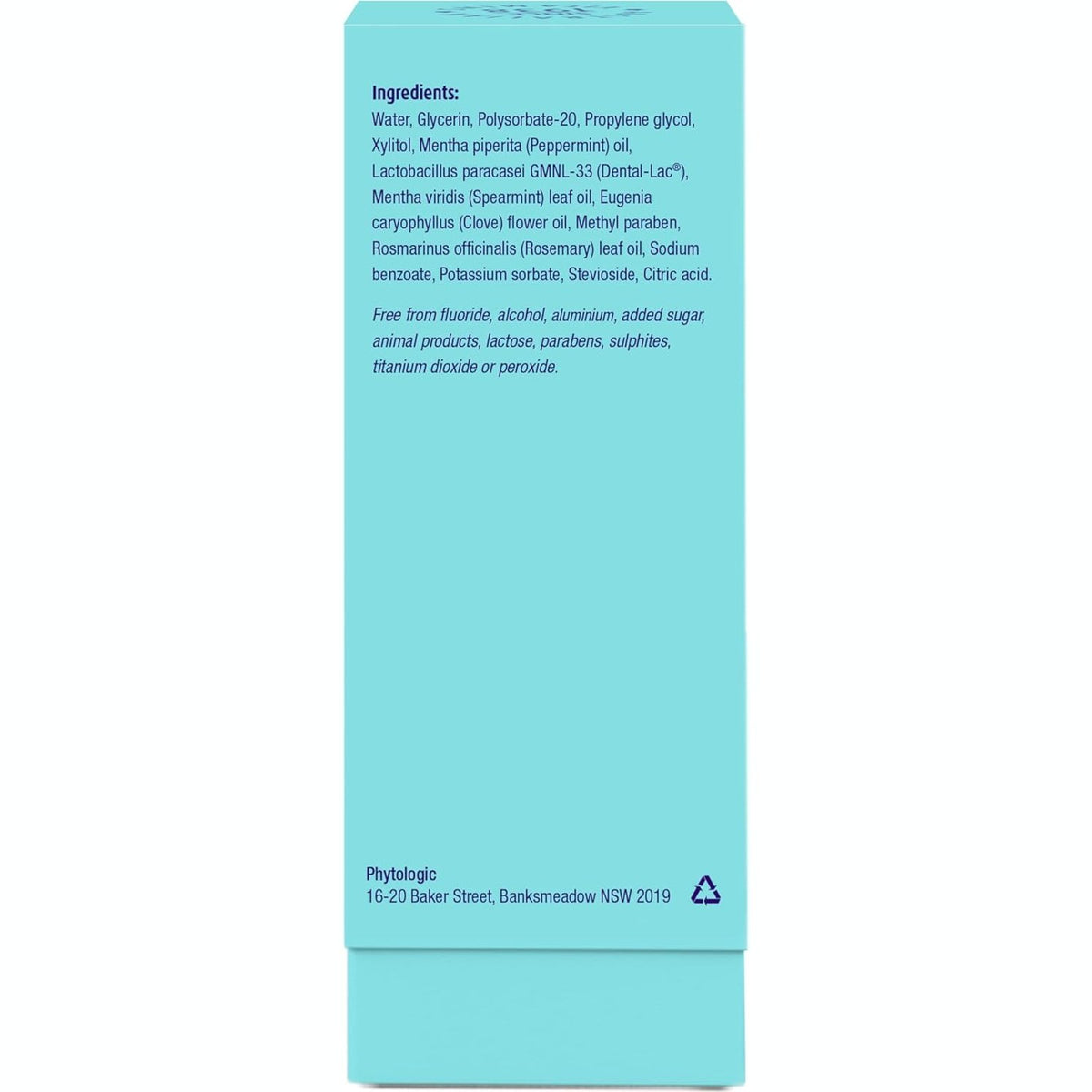 Water, Glycerin, Polysorbate-20, Propylene glycol, Xylitol, Mentha piperita (Peppermint) oil, Lactobacillus paracasei GMNL-33 (Dental-Lac®), Mentha viridis (Spearmint) leaf oil, Eugenia caryophyllus(Clove) flower oil, Methyl paraben, Rosmarinus officinalis (Rosemary) leaf oil, Sodium benzoate, Potassium sorbate, Stevioside, Citric acid.