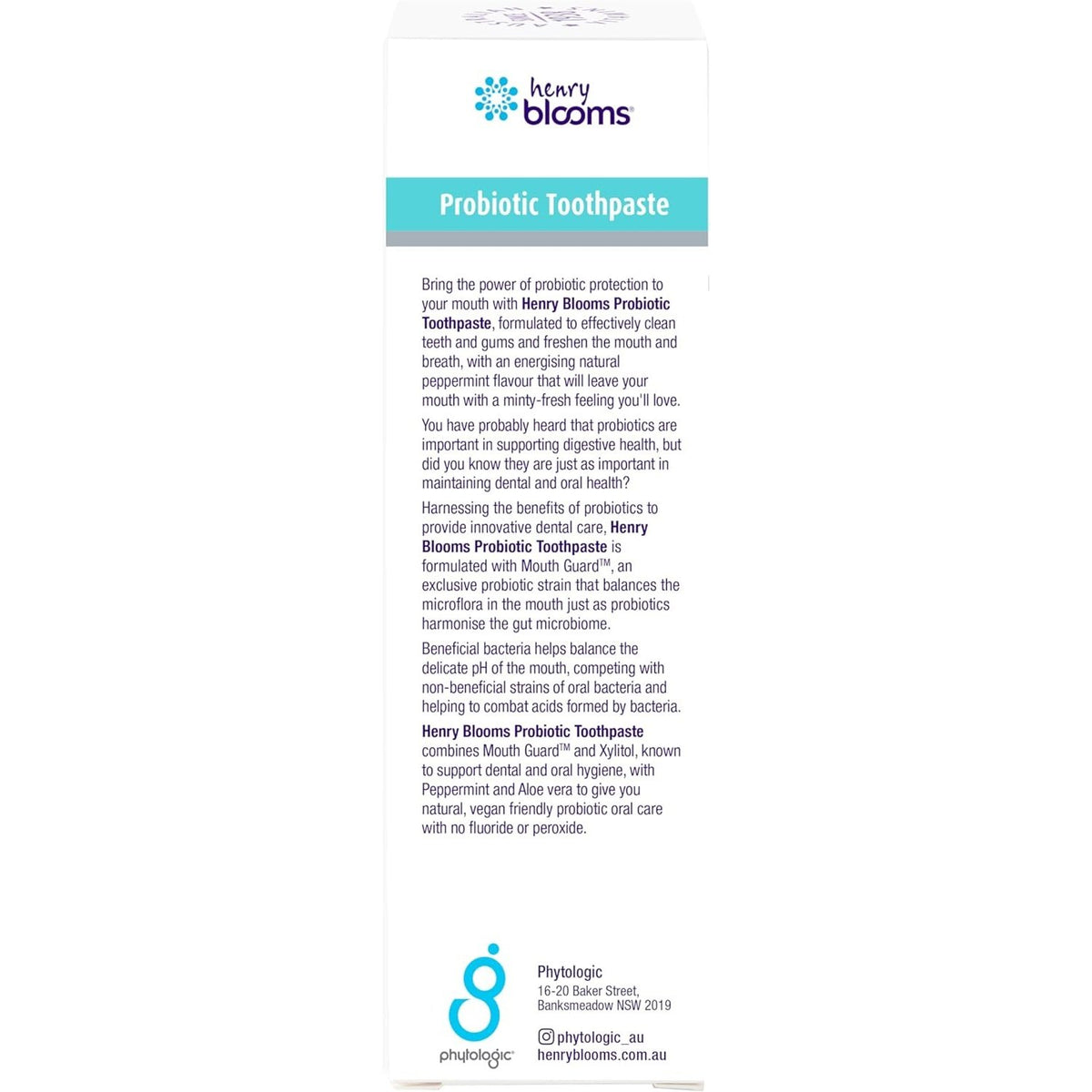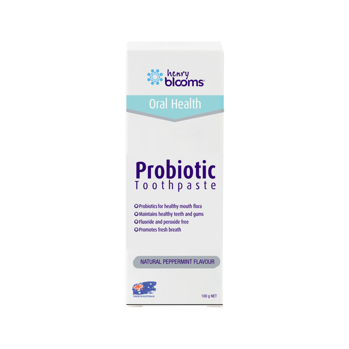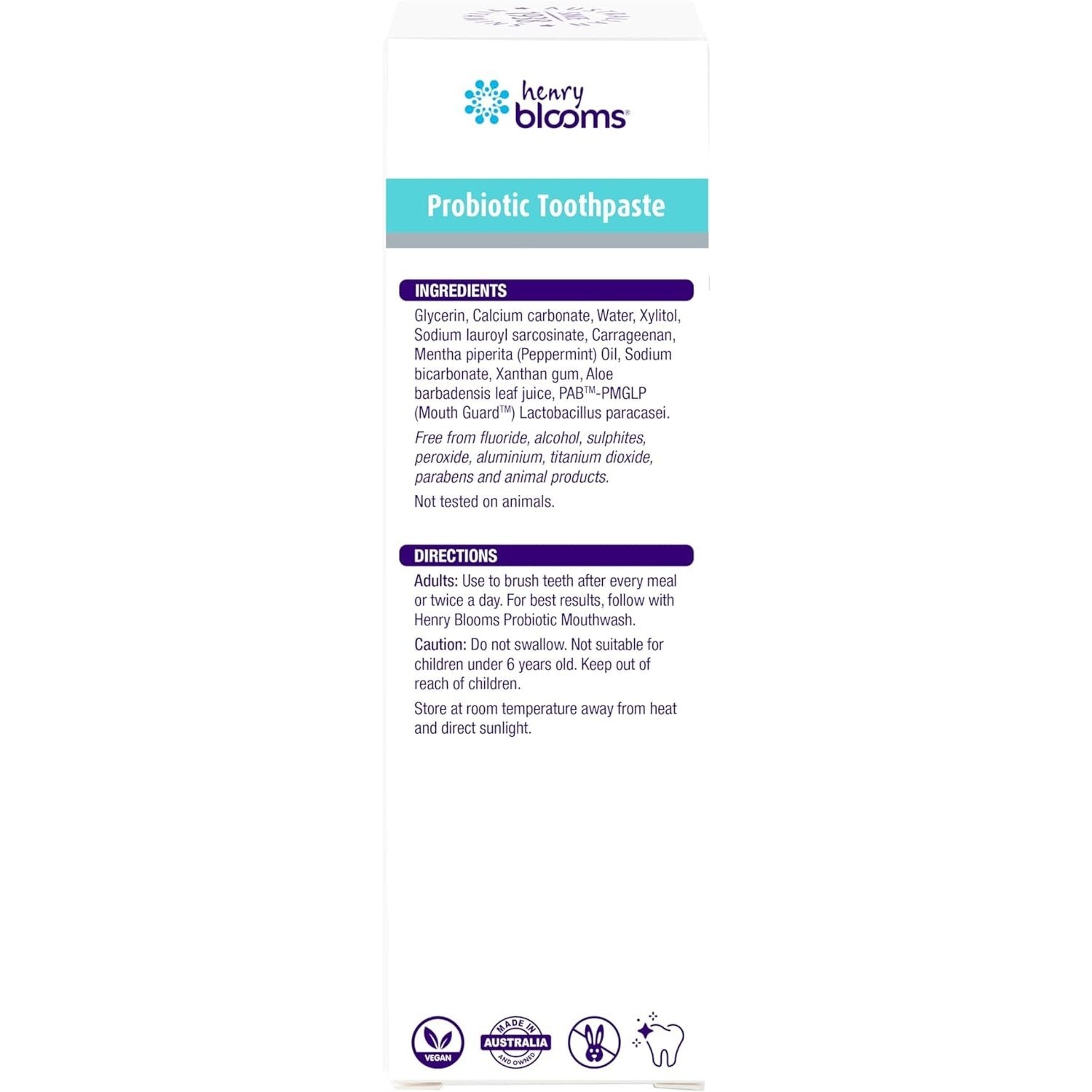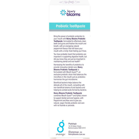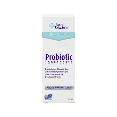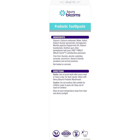 Henry Blooms Probiotic Toothpaste brings probiotic protection to your mouth by combining probiotics and Xylitol to support dental and oral hygiene. Formulated to effectively clean the teeth and gums and freshen the mouth and breath, it will leave your mouth with a natural minty-fresh feeling you'll love.